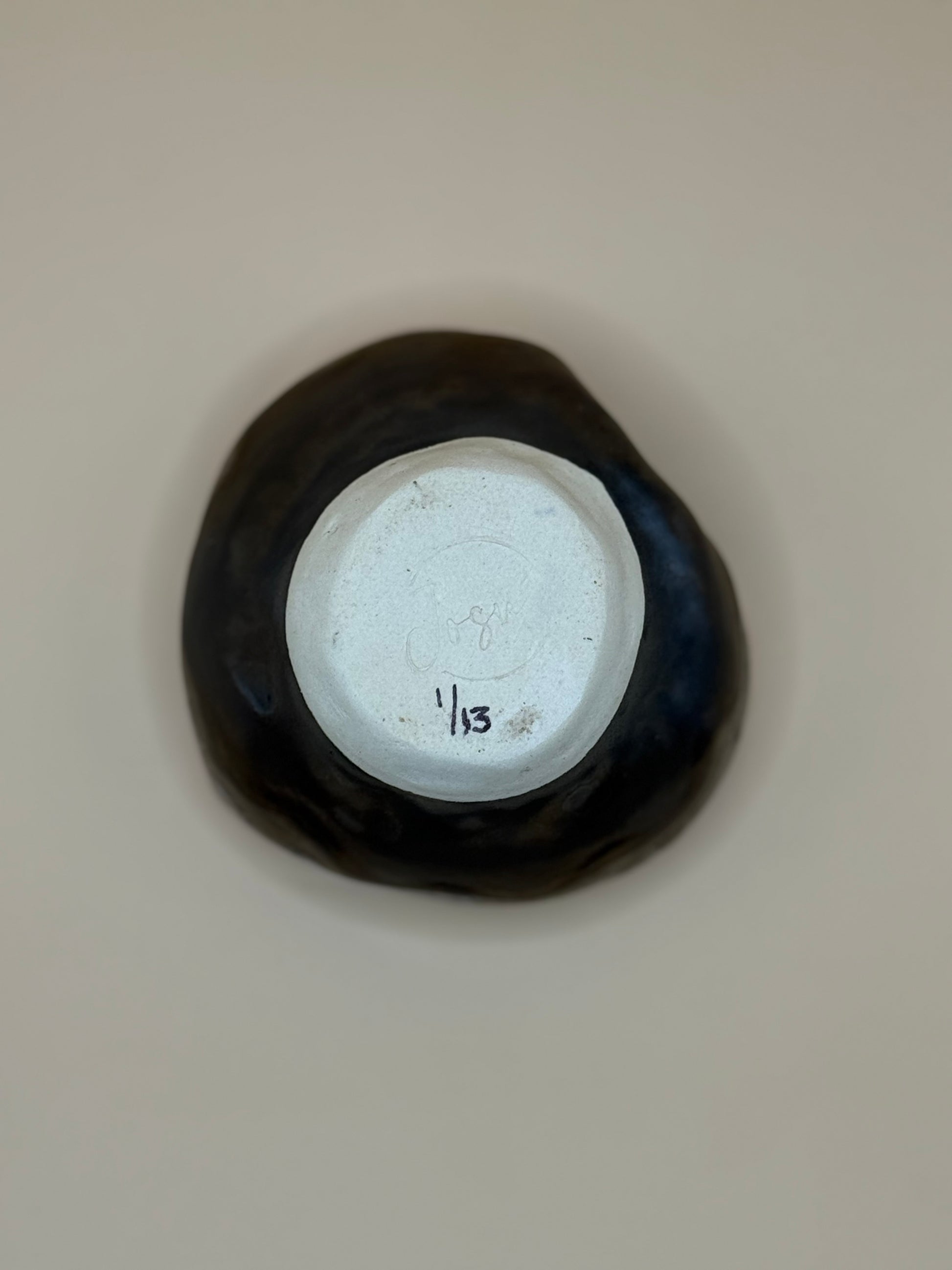 The exterior is a soft, matte black with a dusty rose rim. Inside, glossy glazes of blue, cream, and violet ripple outward from a dark center that resembles a wound — deep, still, and glinting under light. A study in contrast: exposed but intact, delicate yet grounded.