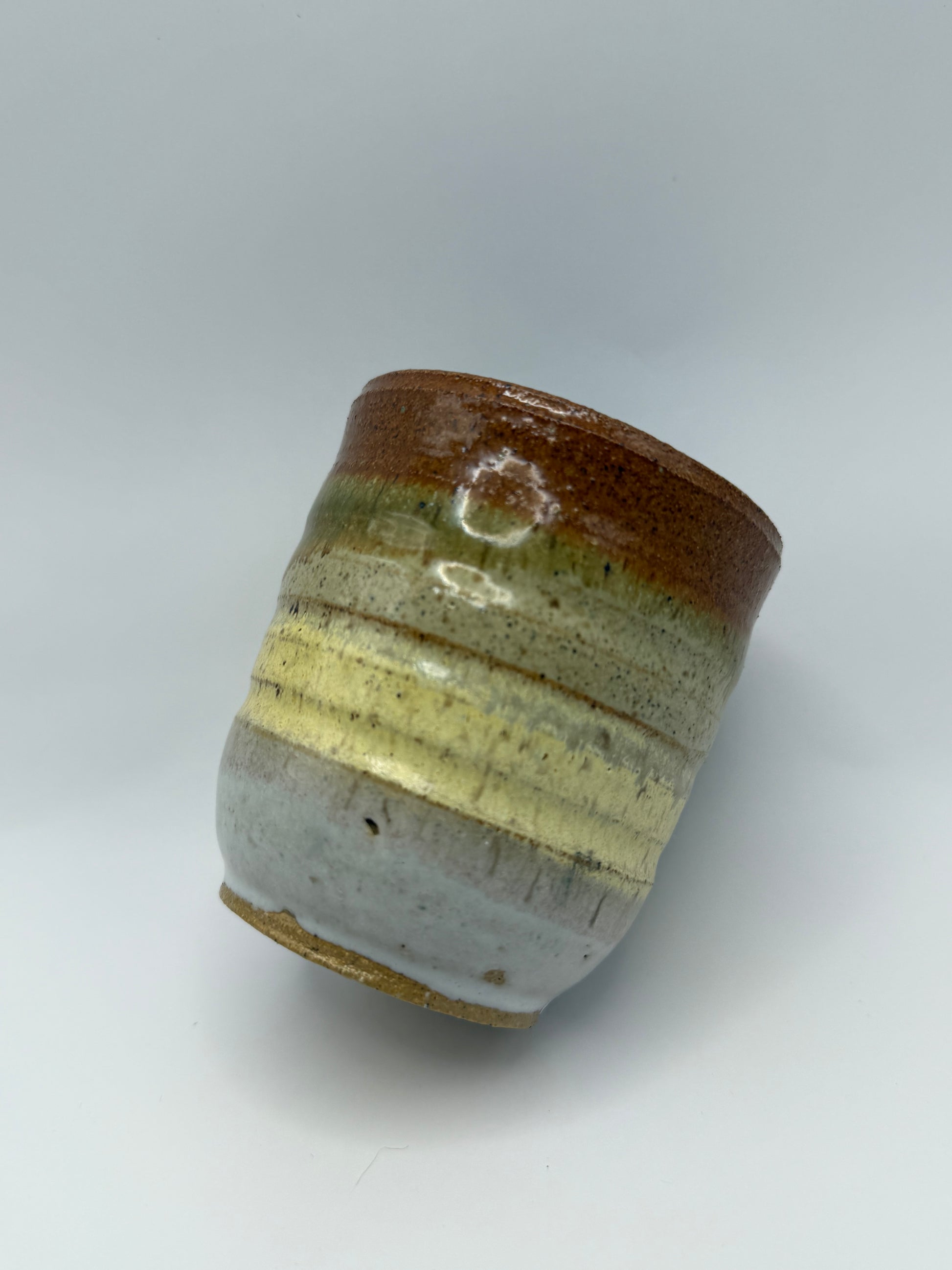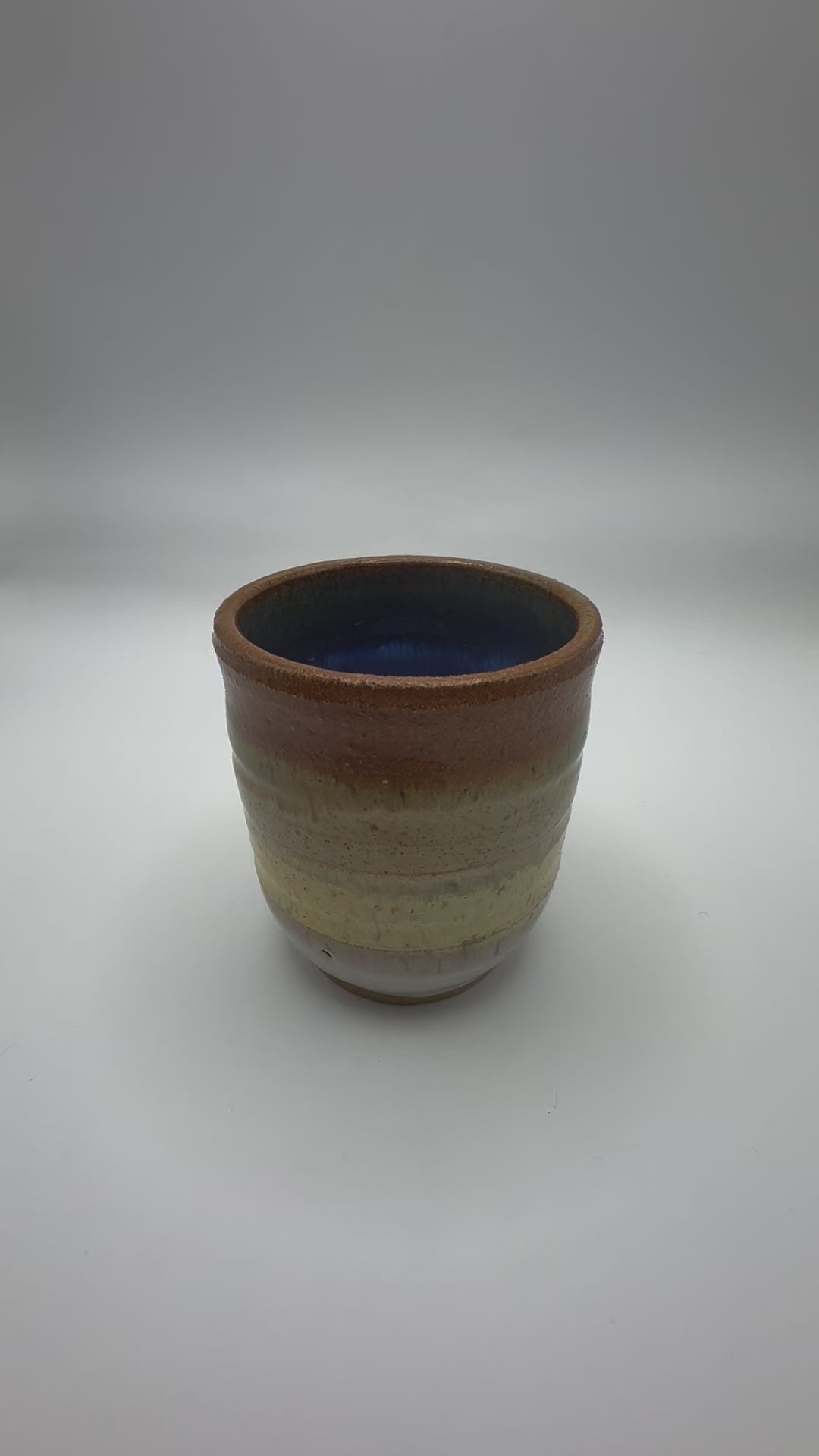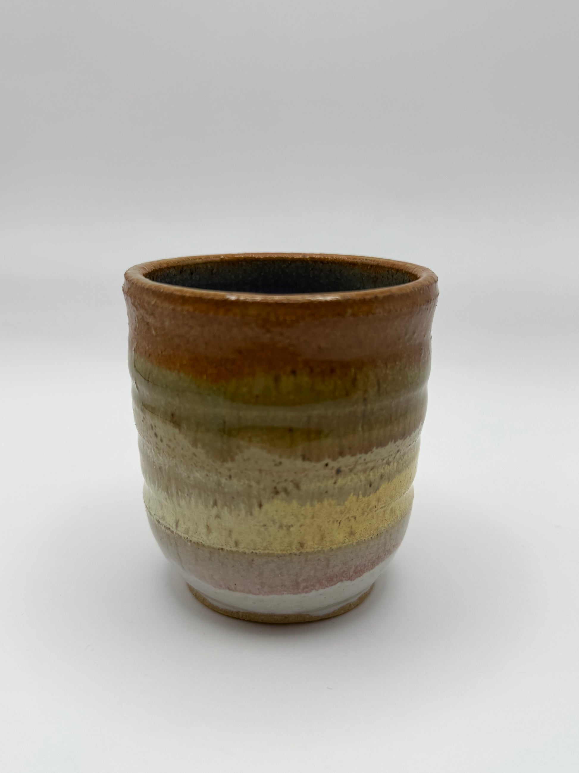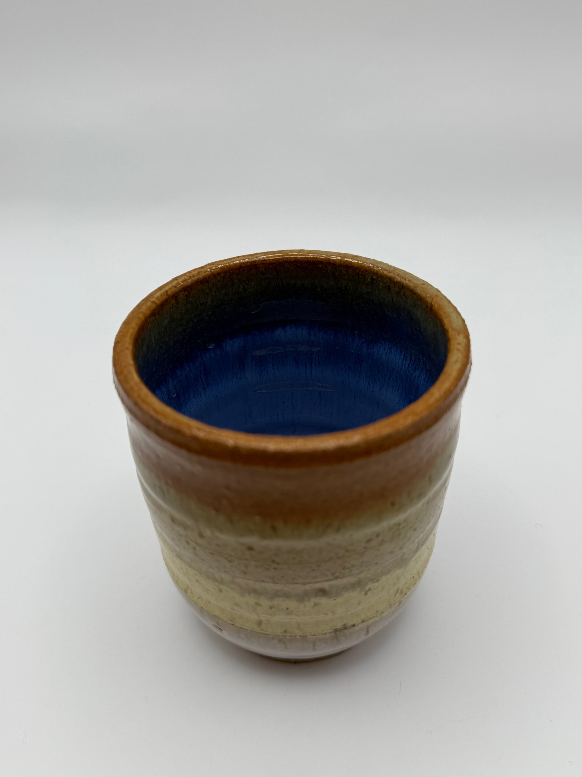 When I made this tumbler, I was experimenting with color gradients in the glazing, playing with how the colors would shift and interact. The top starts with a warm rust orange that gradually transitions into a creamy tone and then fades into a crisp white at the base. I wanted the shifts in color to feel organic, like they had a natural rhythm. Inside, I used a sky blue glaze for a soft, calming contrast, reminiscent of looking into a clear sky. This piece captures my exploration of layering colors and creating movement through glazing.