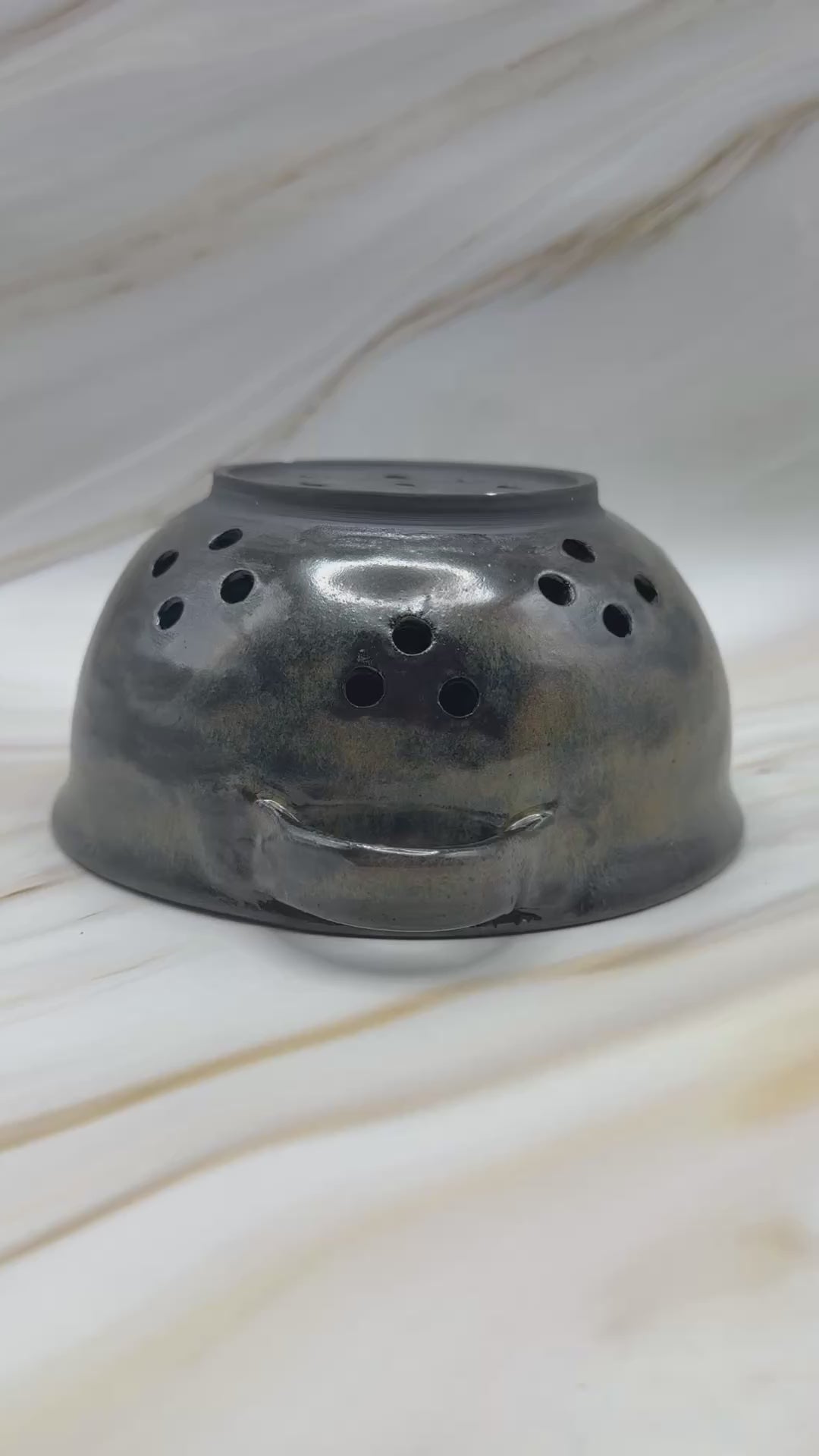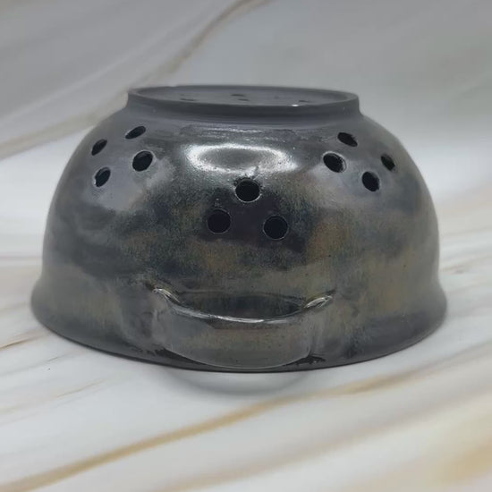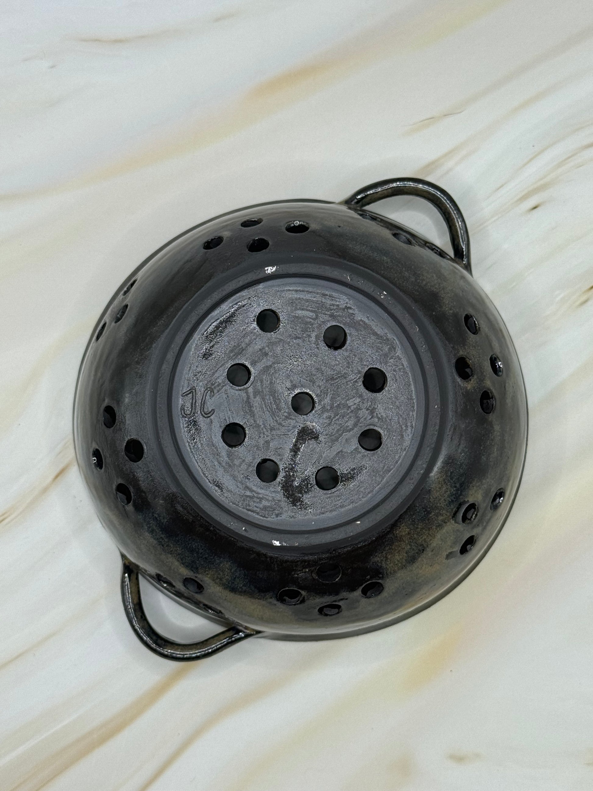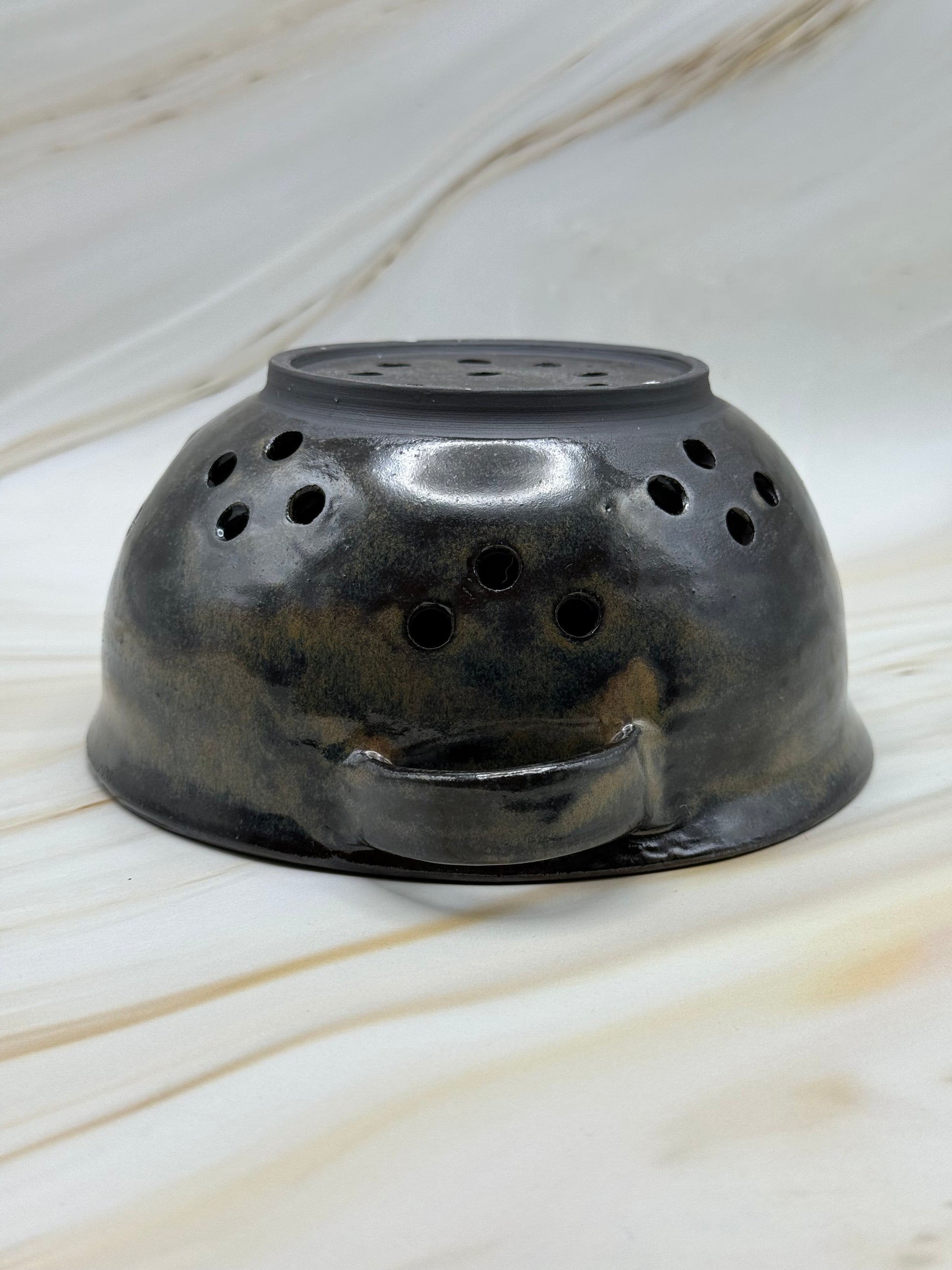 Artifact C-B-01, recovered from the Caldera Expanse excavation site of Obsidian-12A, shows signs of practical utility in food gathering and preparation. Its pierced surface and rounded basin suggest it once served as a vessel for washing or straining small fruits or grains. The glaze has pooled into dark metallic sheens with shifting tones of black and bronze, evoking both durability and the passage of time.