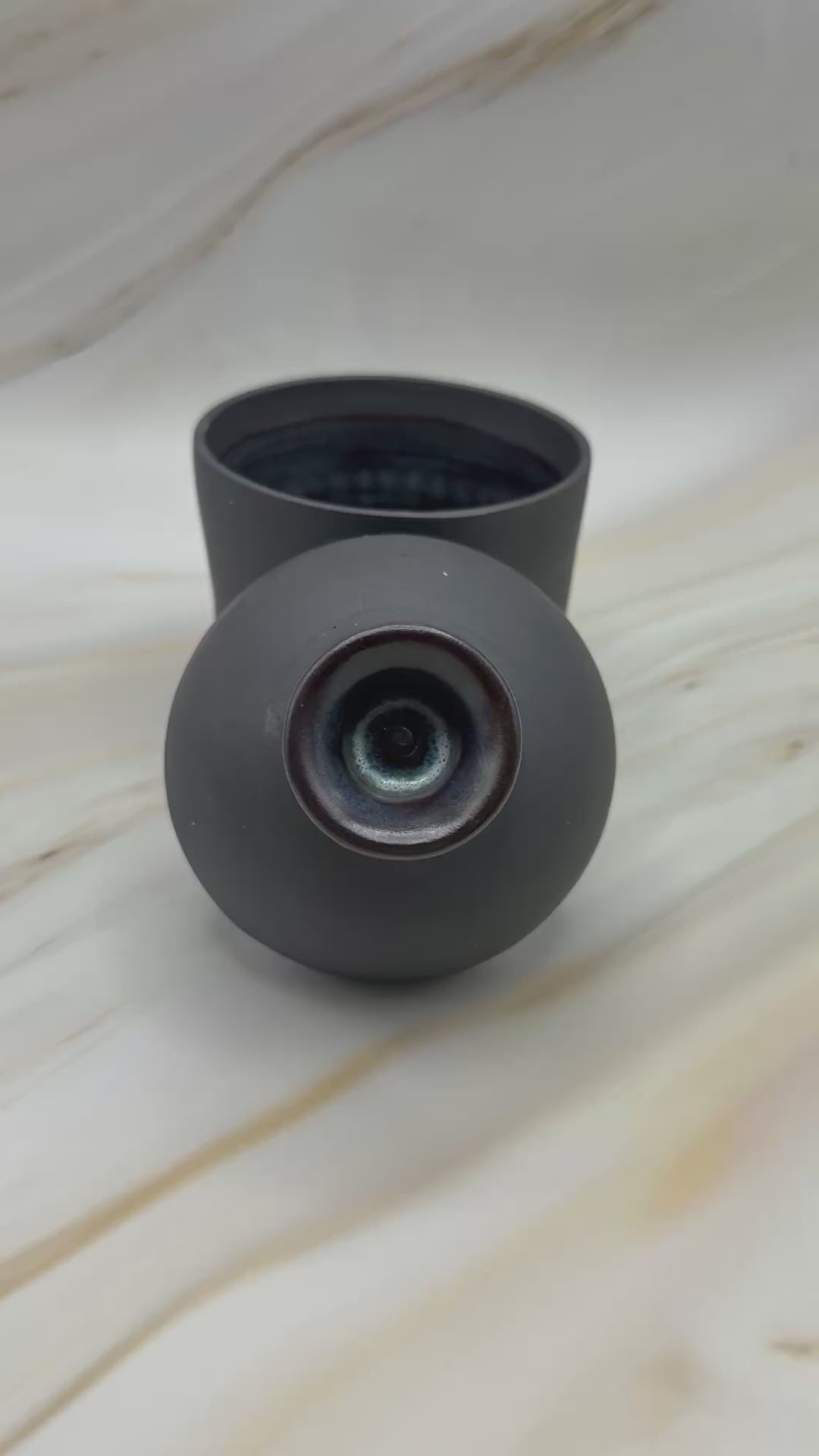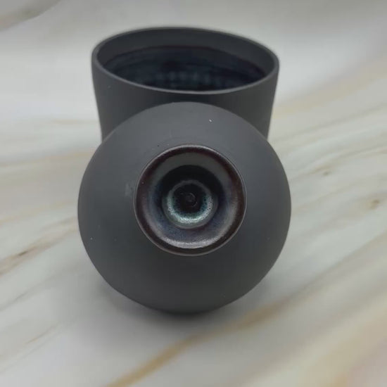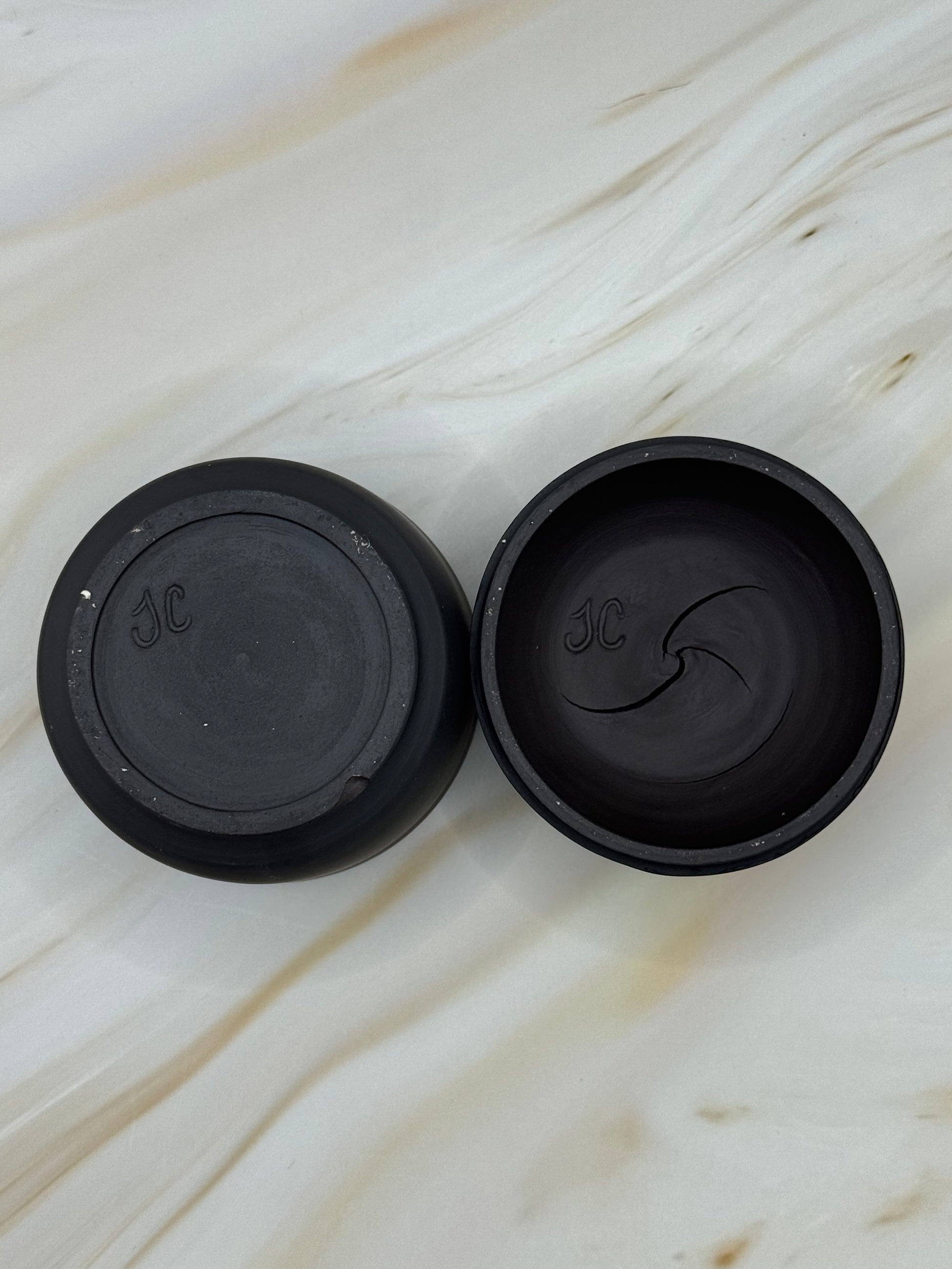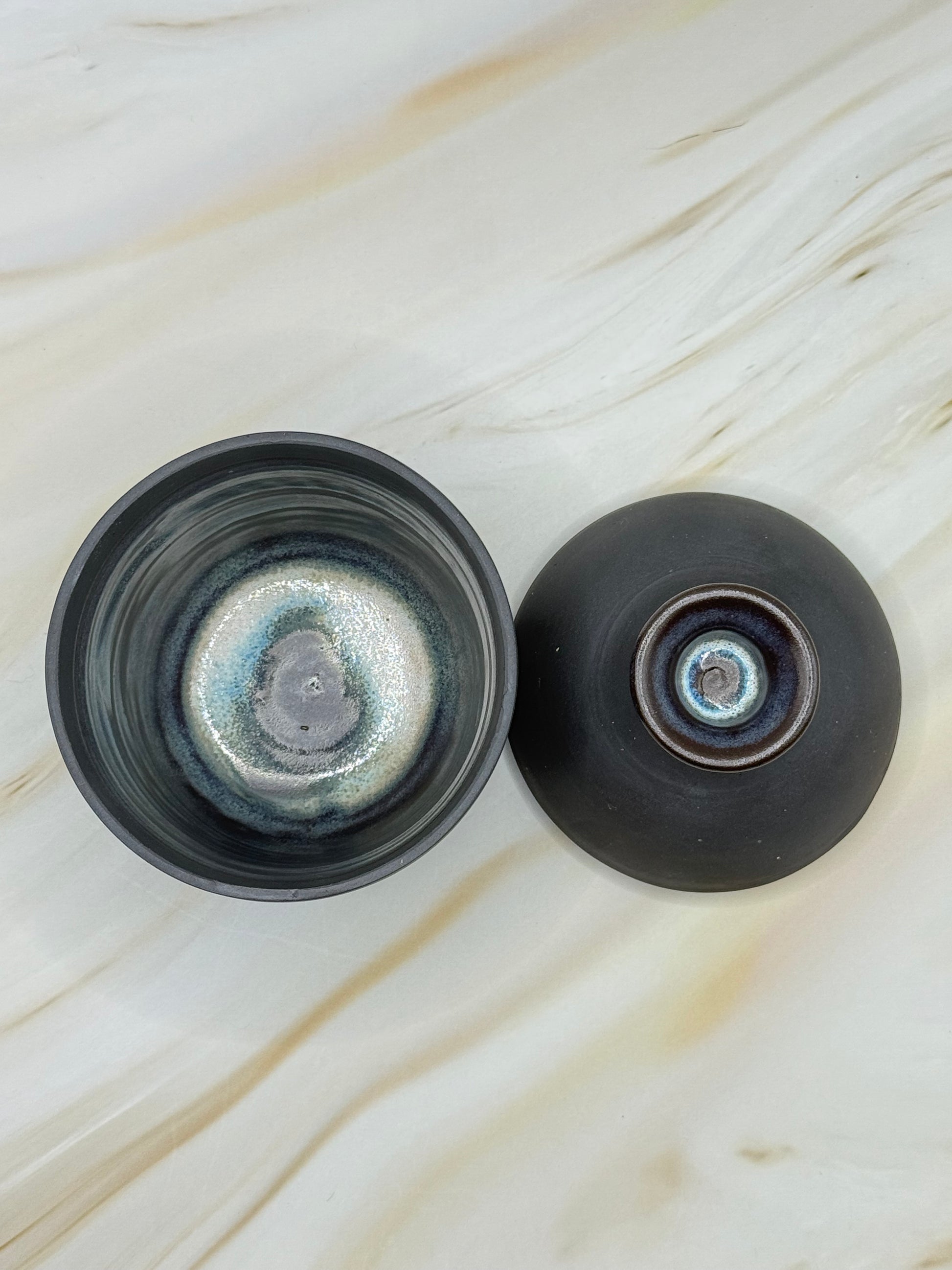Artifact C-L-01, recovered from the Caldera Expanse excavation site of Obsidian-12A, stands as a sealed container with a domed lid and subtle taper. The exterior remains unglazed in deep black clay, smooth to the touch, while the interior of the lid’s raised knob reveals layered bands of storm-grey, ash-white, and pale blue glaze — a swirling horizon encased within. The underside of the lid shows three intersecting cracks, forming almost a spiral pattern; these do not affect fit, stability, or use.