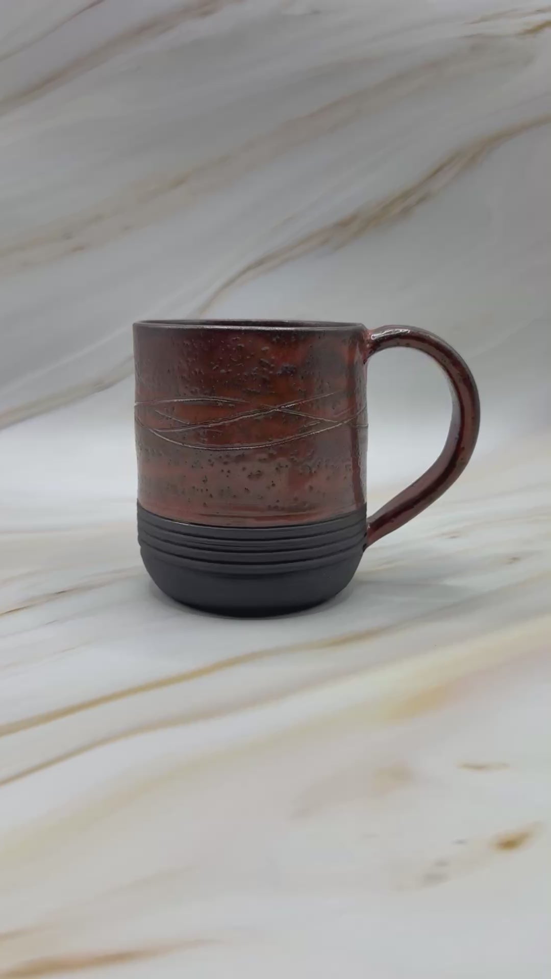 Artifact A-M-03, recovered from the Arid Flats excavation site of Obsidian-12A, carries a burnished surface with red-brown tones flecked in darker ash. A carved line motif circles the midsection, dividing the smoother upper glaze from the ridged black base, evoking a horizon of shifting heat and stone.