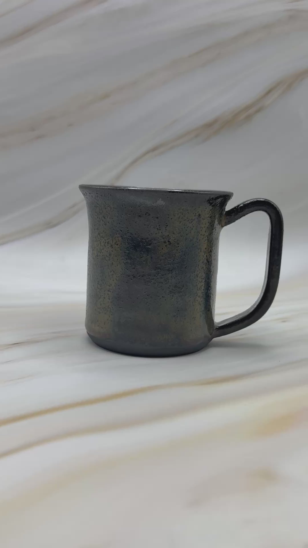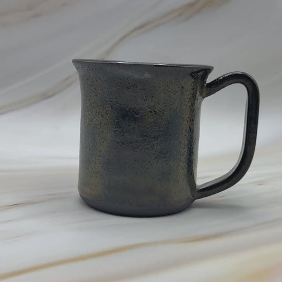 Artifact C-M-02, recovered from the Caldera Expanse excavation site of Obsidian-12A, bears the dark, metallic sheen of cooled volcanic stone. Its tall cylindrical walls flare outward at the rim, recalling the shape of ancient vessels forged for both ritual and survival in lands shaped by fire. The surface shifts between matte and faintly lustrous tones, echoing mineral deposits left in cooling lava fields.