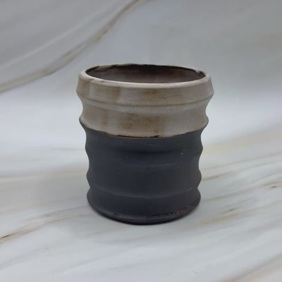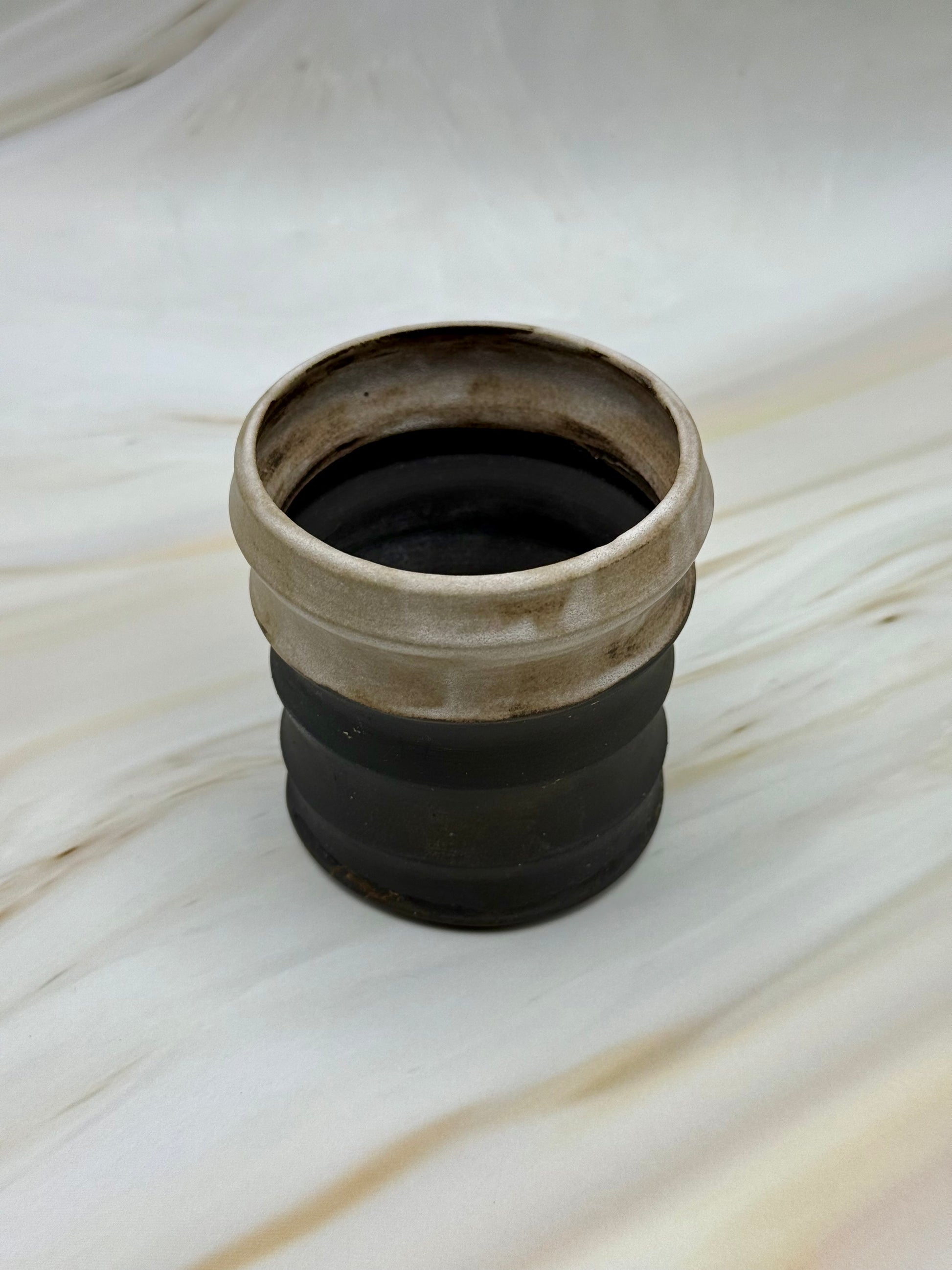 Artifact A-T-01, recovered from the Arid Flats excavation site of Obsidian-12A, presents a dark, ridged body contrasted by a pale, weathered rim. The sharp banding and tonal divide suggest a utilitarian form shaped for endurance.