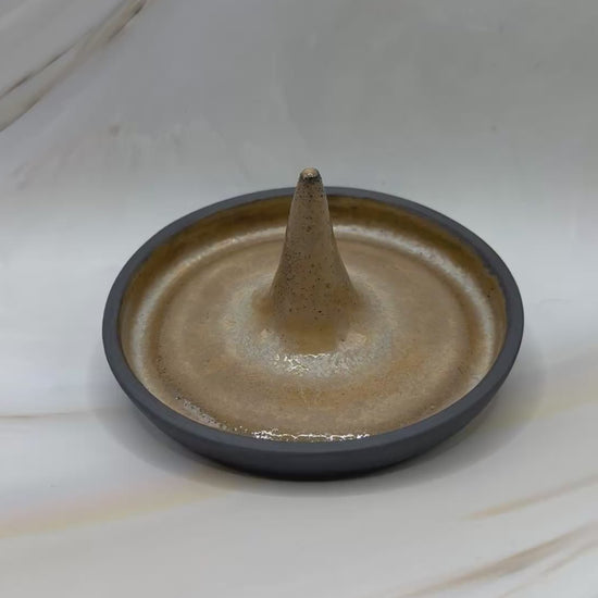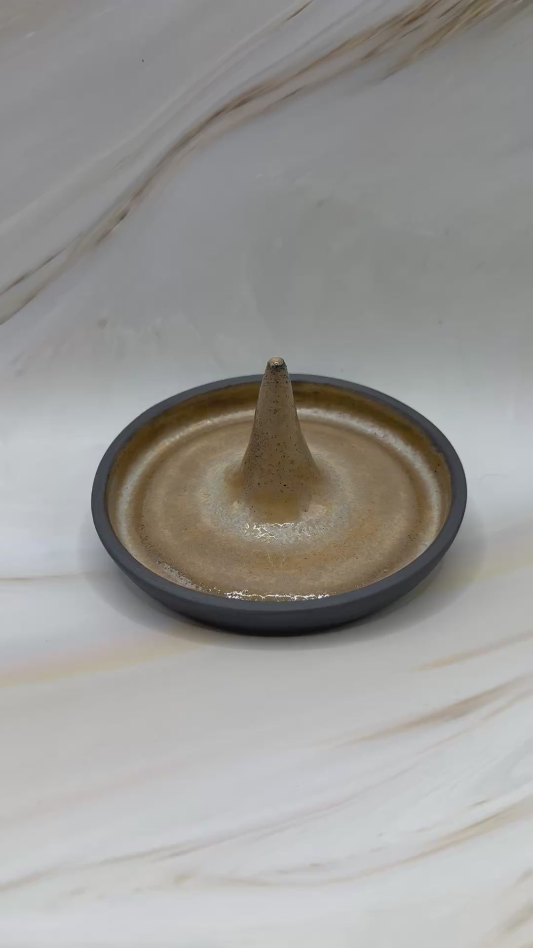 Artifact A-X-01, recovered from the Arid Flats excavation site of Obsidian-12A, is formed as a low dish with a central spire rising from its core. Finished in warm, sand-toned glaze with a dark outer rim, it was designed to hold rings and small adornments securely.