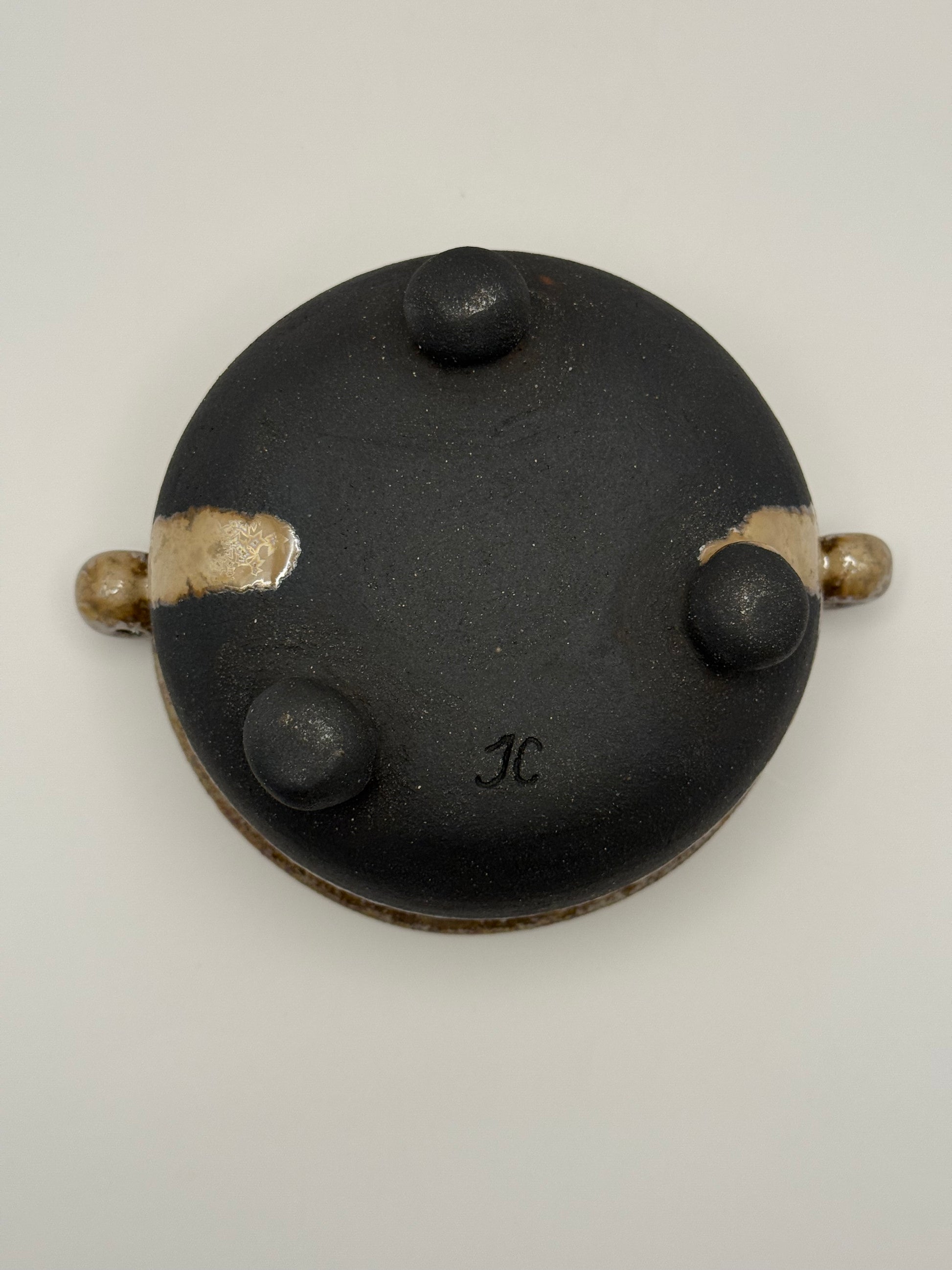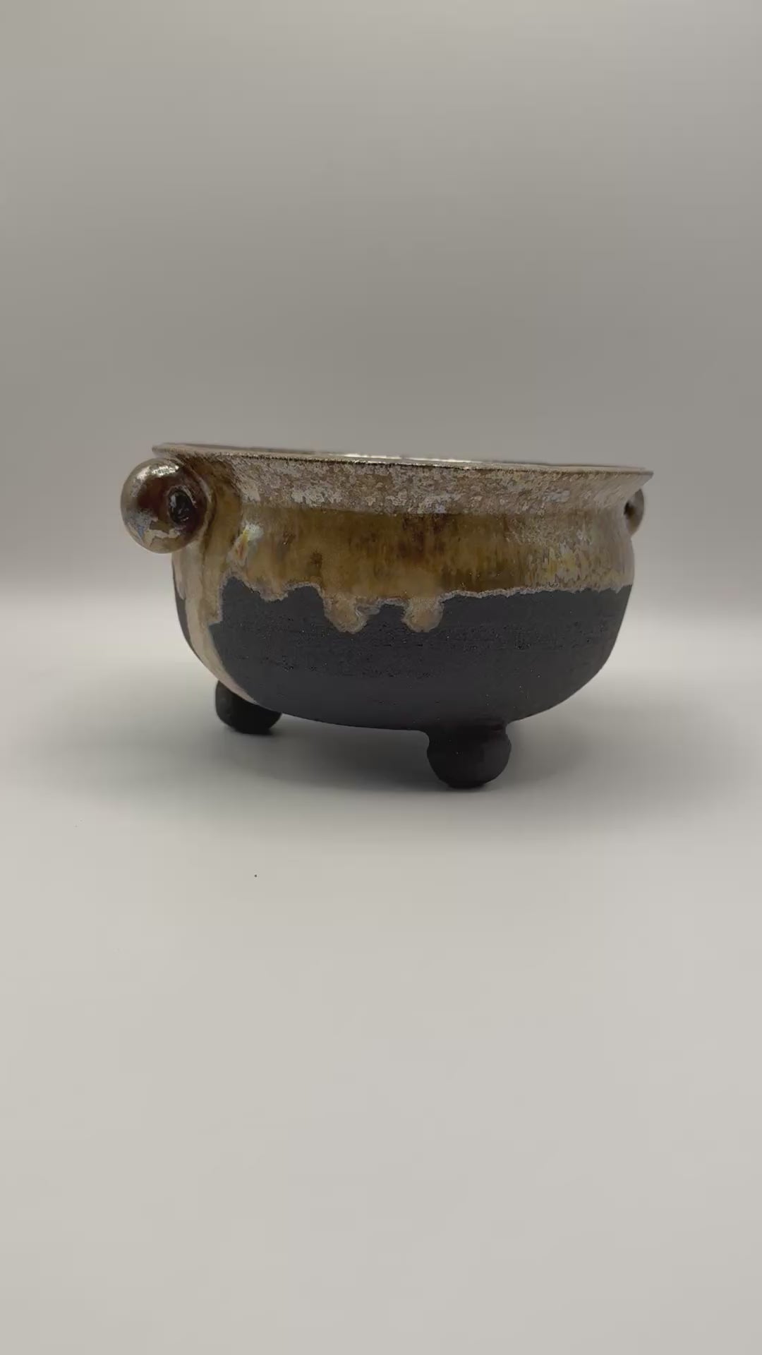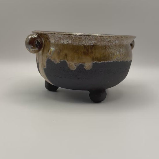 Handcrafted in black clay with a metallic bronze rim that melts and drips along the edge, Cauldron II carries the spirit of autumn rituals with its glowing, weathered texture. Balanced on three rounded feet, it’s the perfect in-between size for holding candy, incense, or serving as a centerpiece where firelight and shadow can gather.