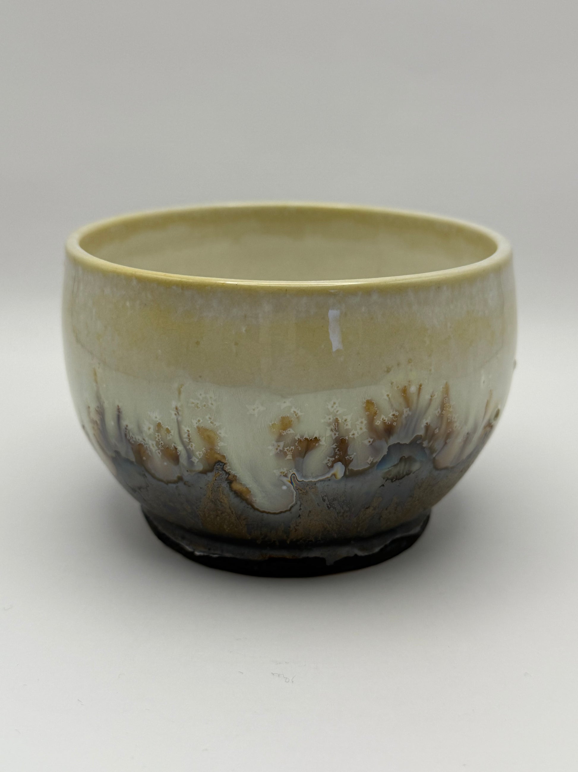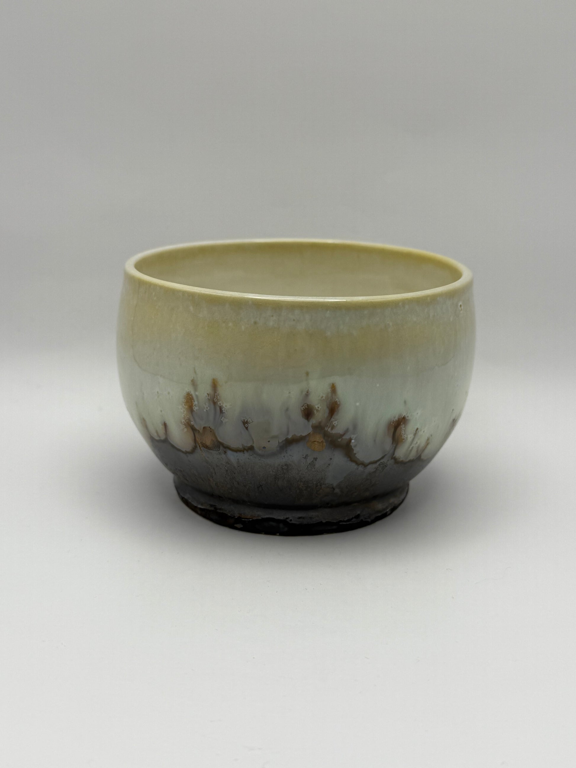 Golden flames meet melting ivory in this mini bowl, where soft glazes flow from a pale rim into muted gold with bronze undertones. The surface captures the look of heat in motion, layered and fluid with delicate crystalline texture, creating a striking balance between softness and intensity.