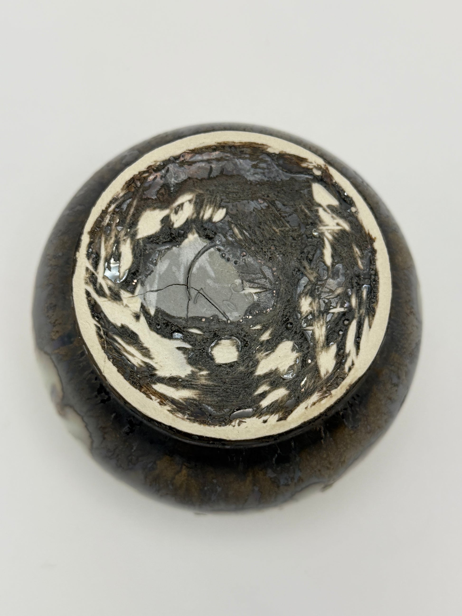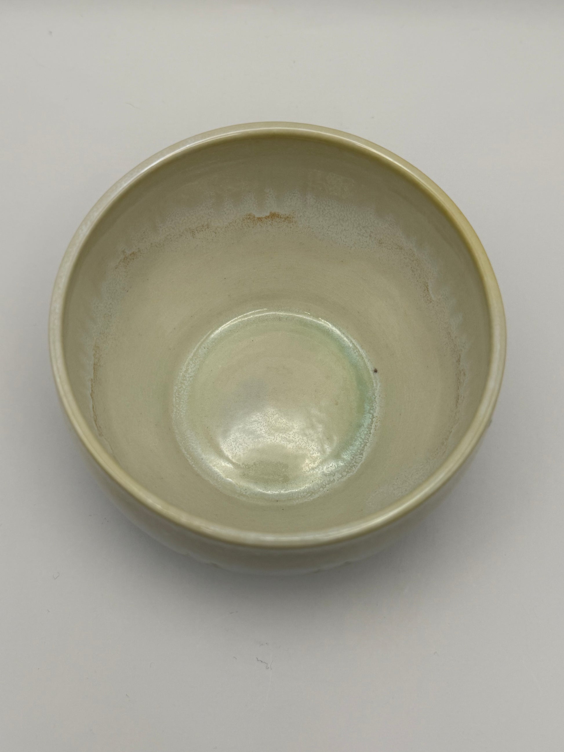Inside, a smooth satin glaze in soft ivory is laced with a hint of muted green, a cool tone that catches the light and deepens the contrast. A small section of the base was sanded after minor kiln shelf contact. The surface remains stable and functional, carrying a visible reminder of the making process.