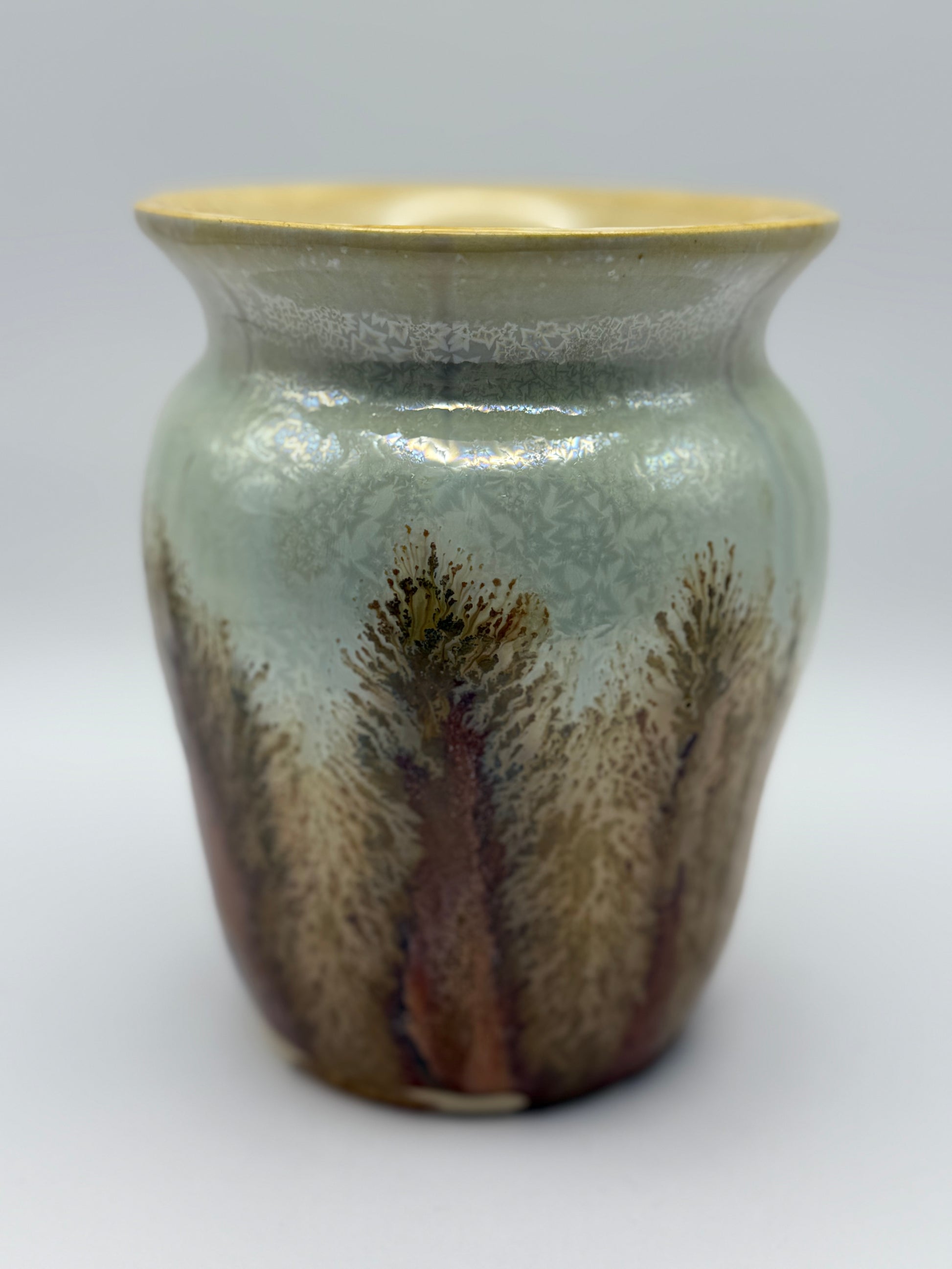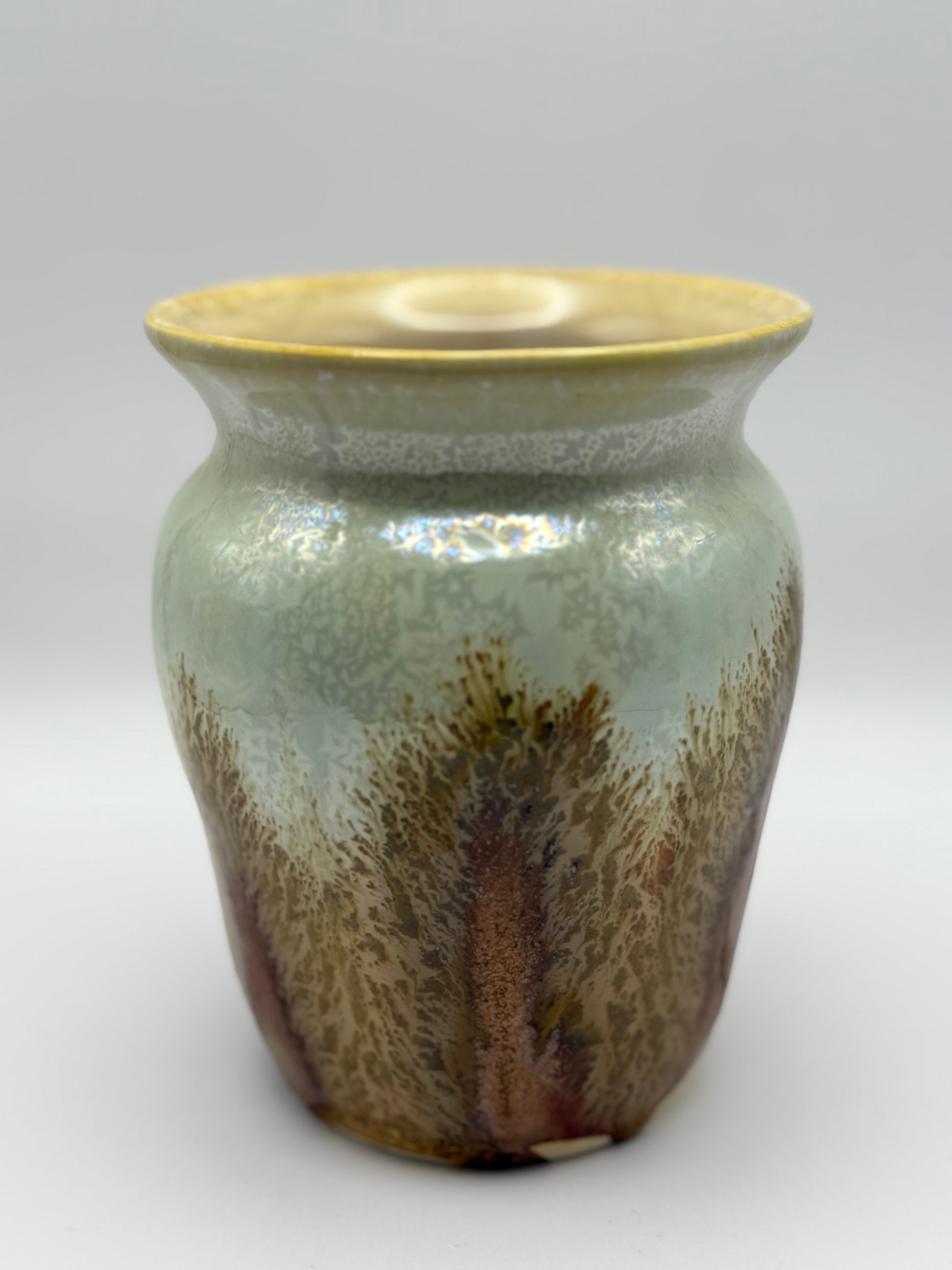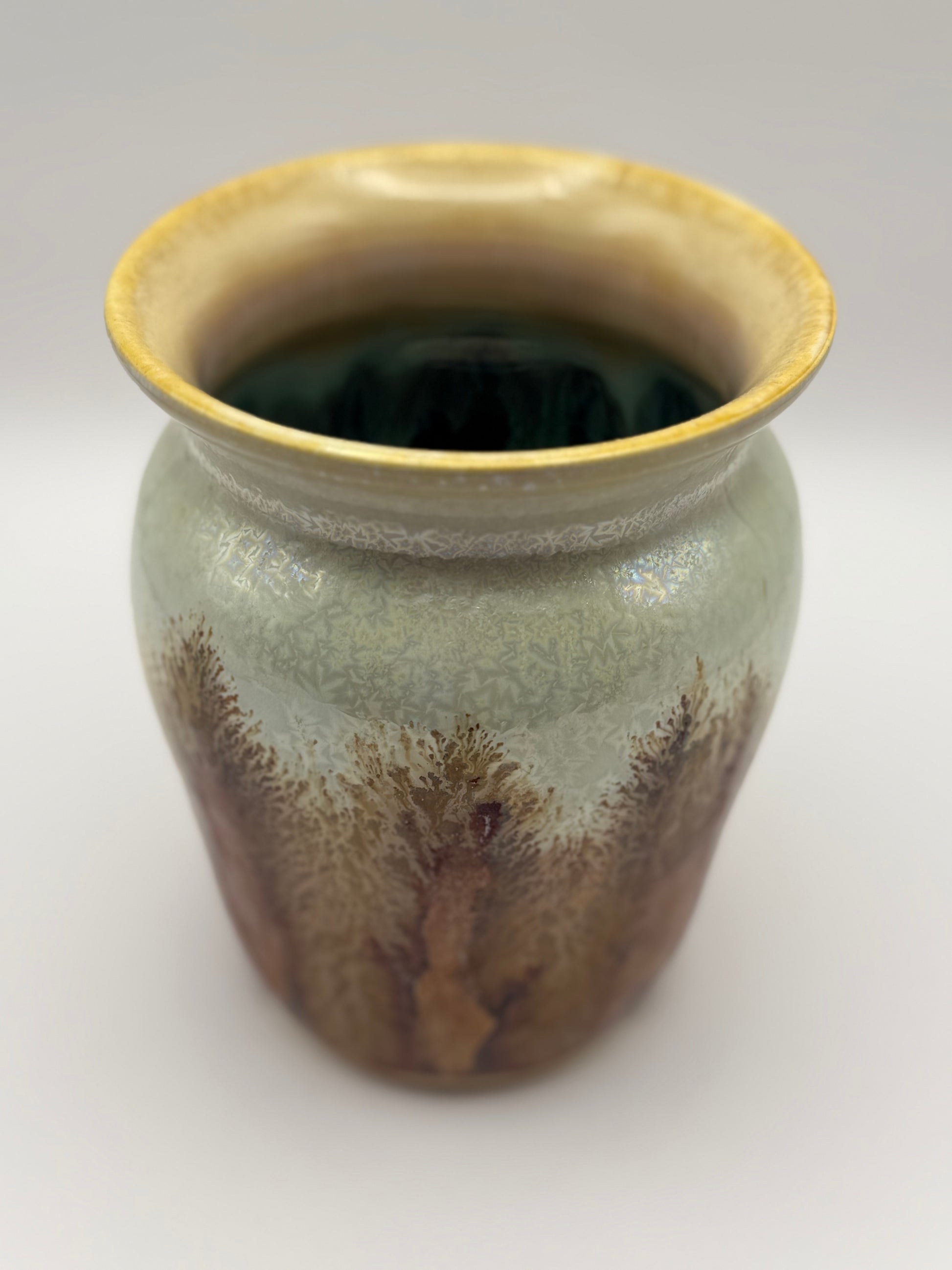 Molten Flame features a warm, energetic surface that flows from coppery base tones into amber and golden hues. Lighter glaze breaks along the rim reveal soft transitions with slight crystalline variation, giving the surface movement and complexity.