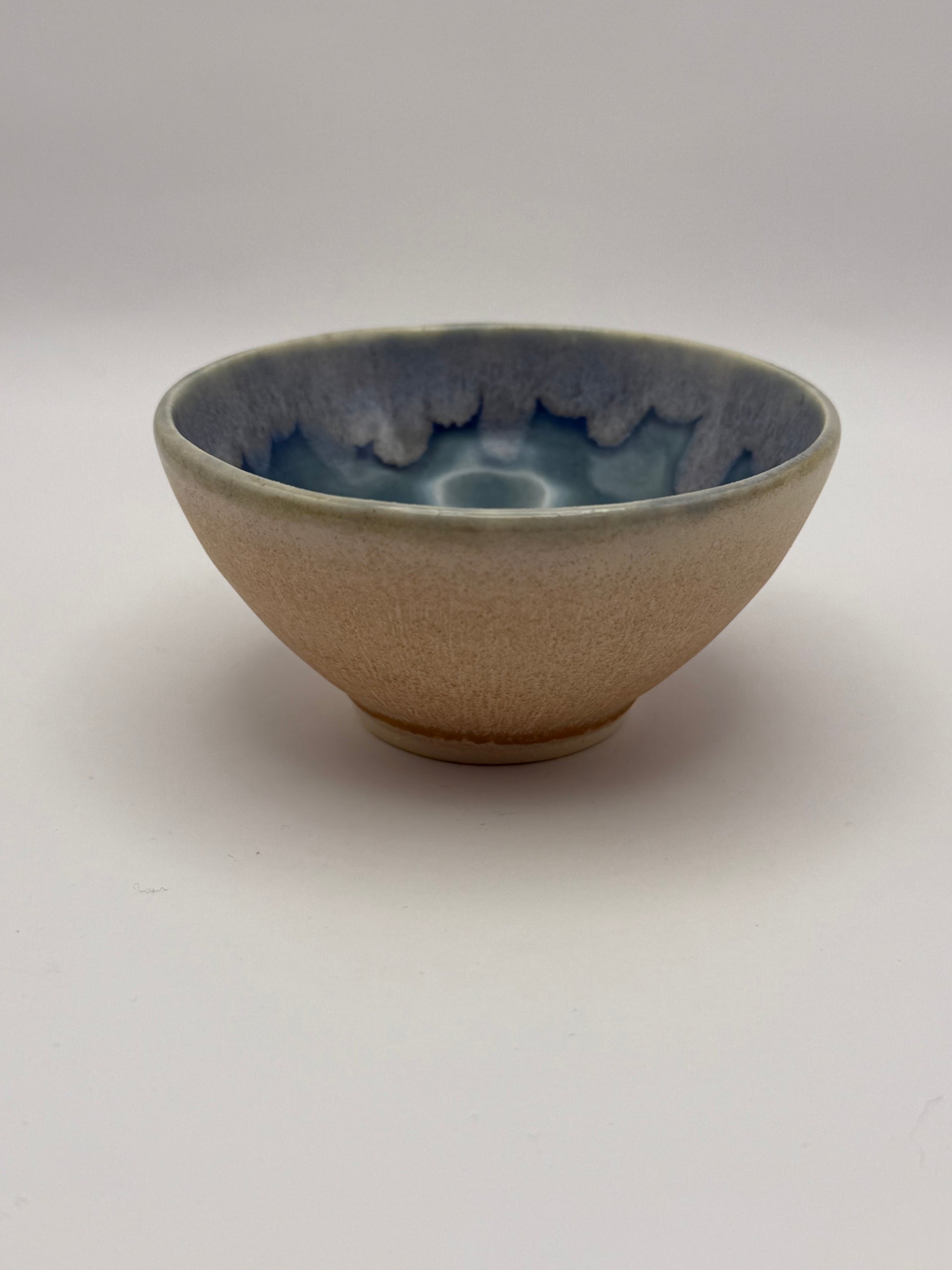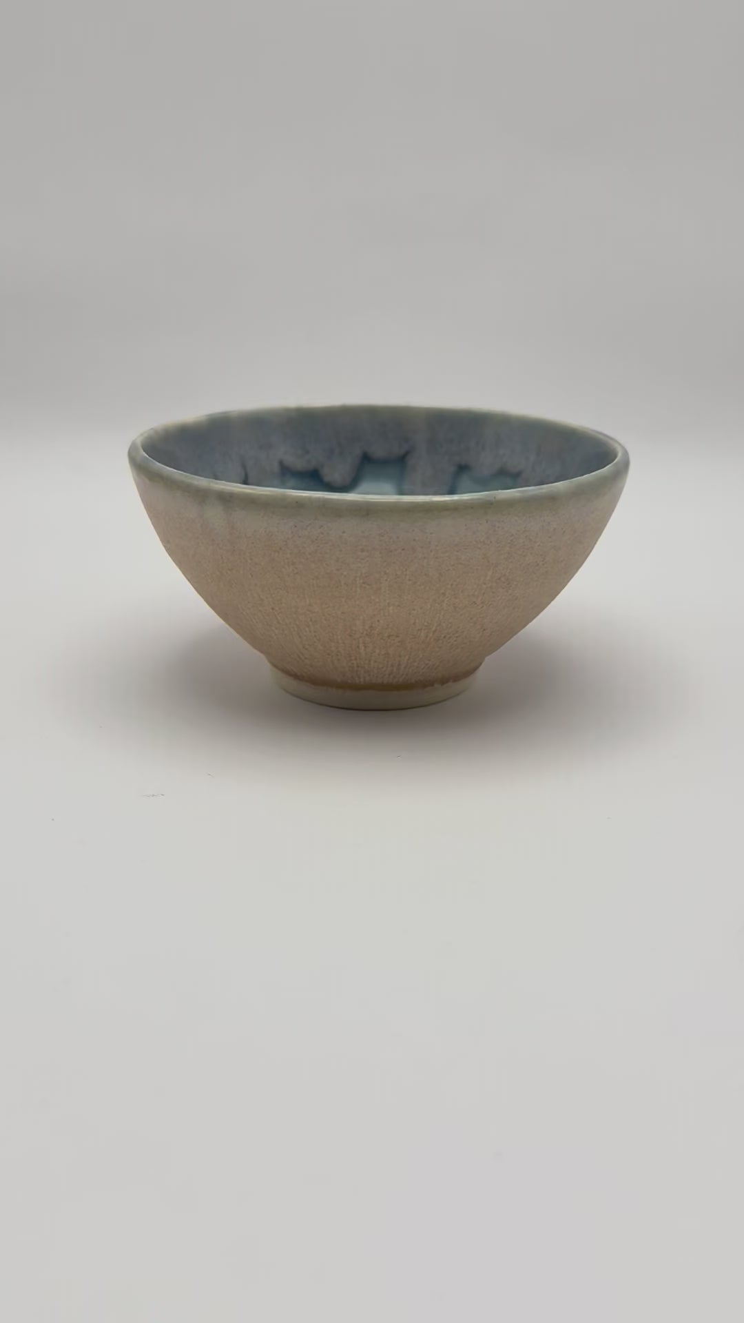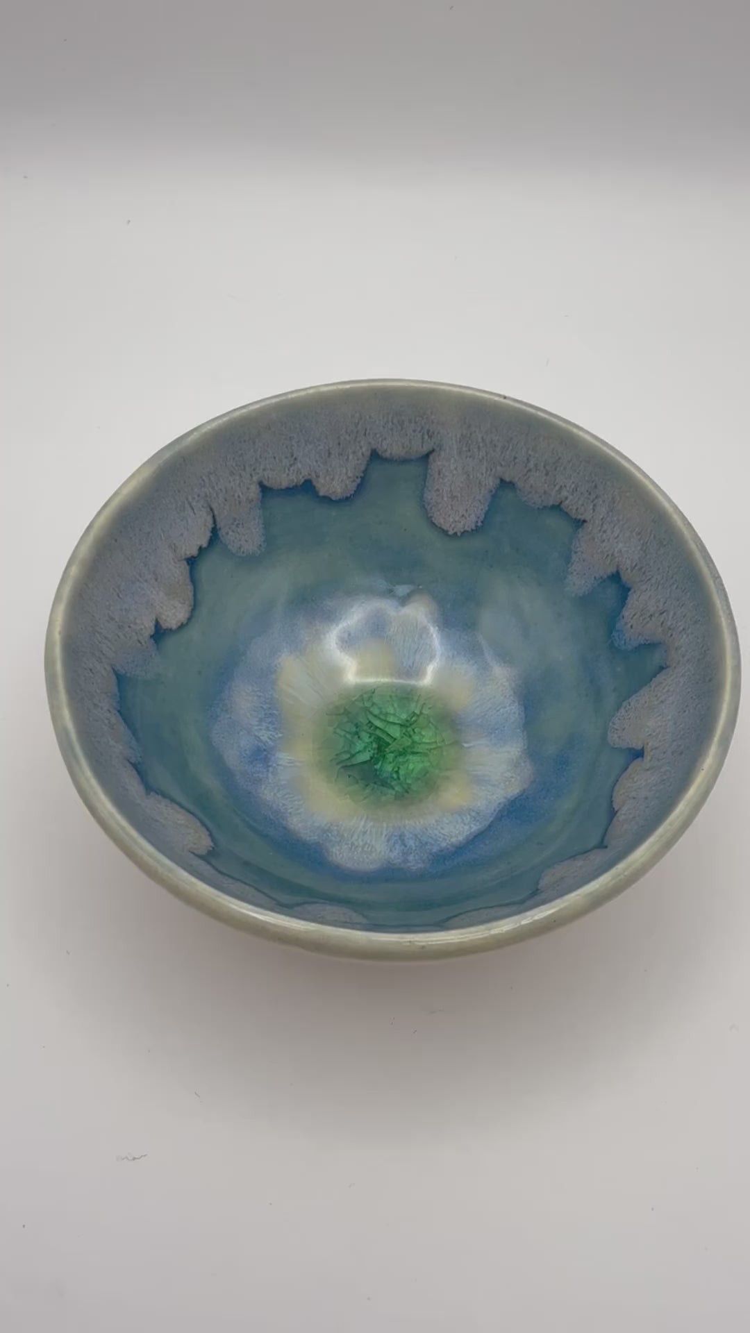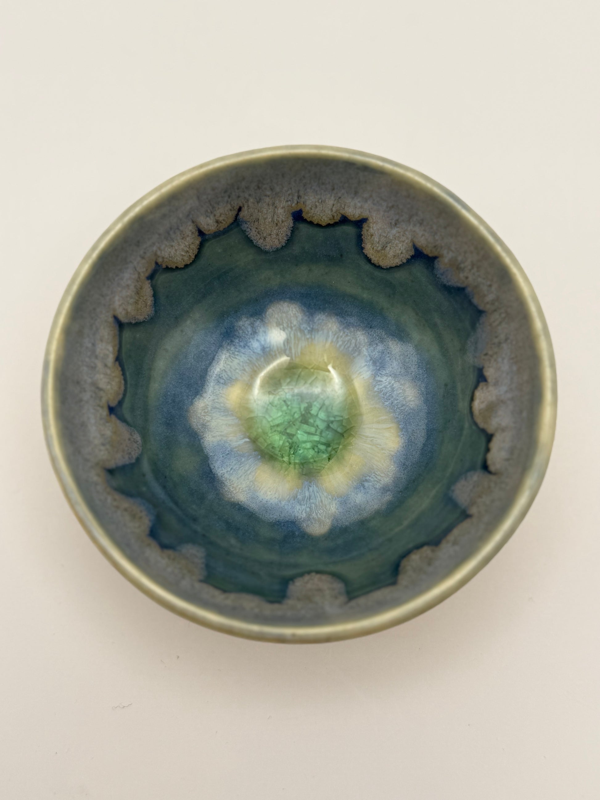 Named for the soft green glow at its center, the Moss Light mini bowl features a smooth, layered glaze that blends deep blue, pale ivory, and a crackled green accent reminiscent of moss under water or light through leaves.
