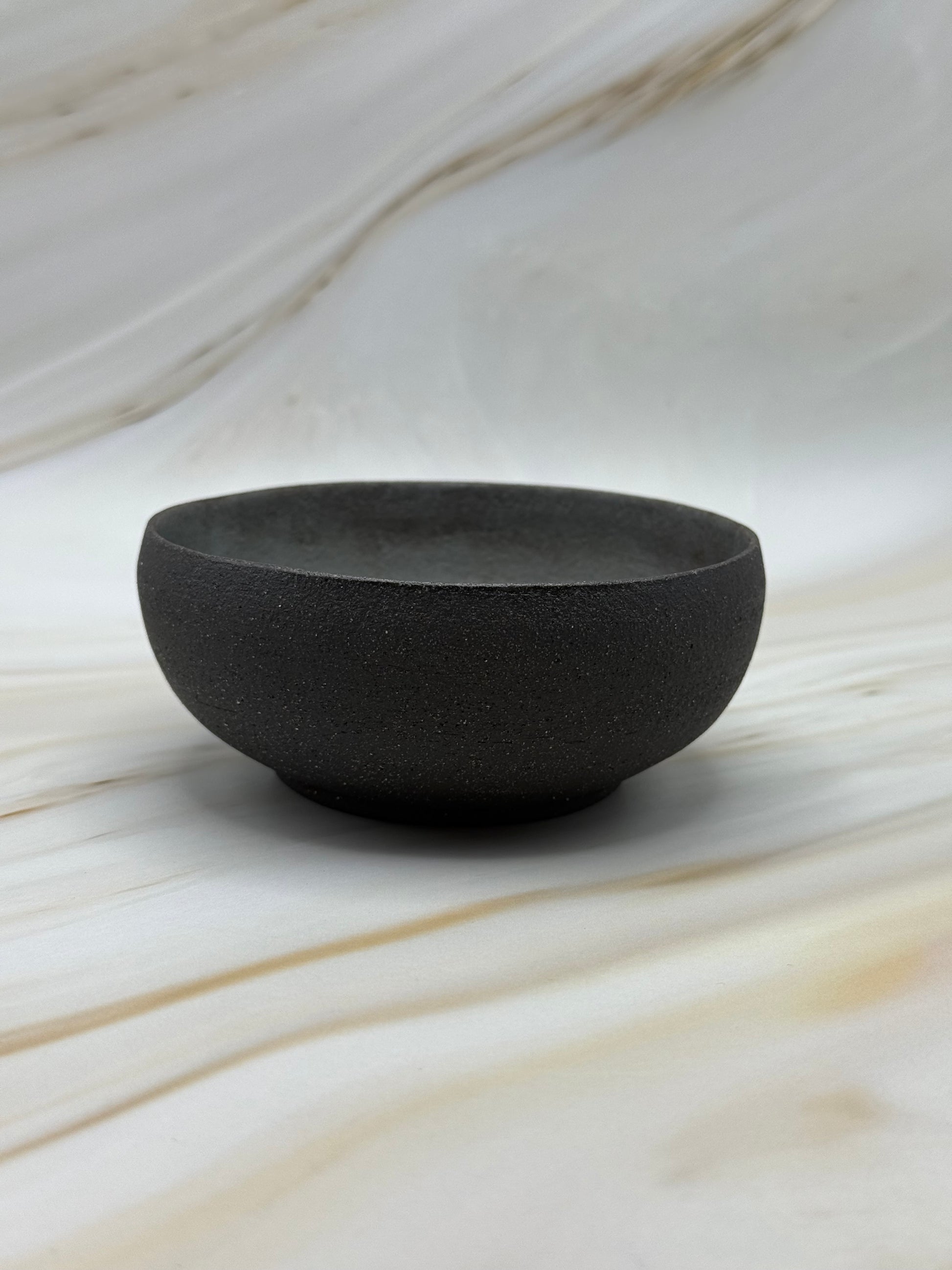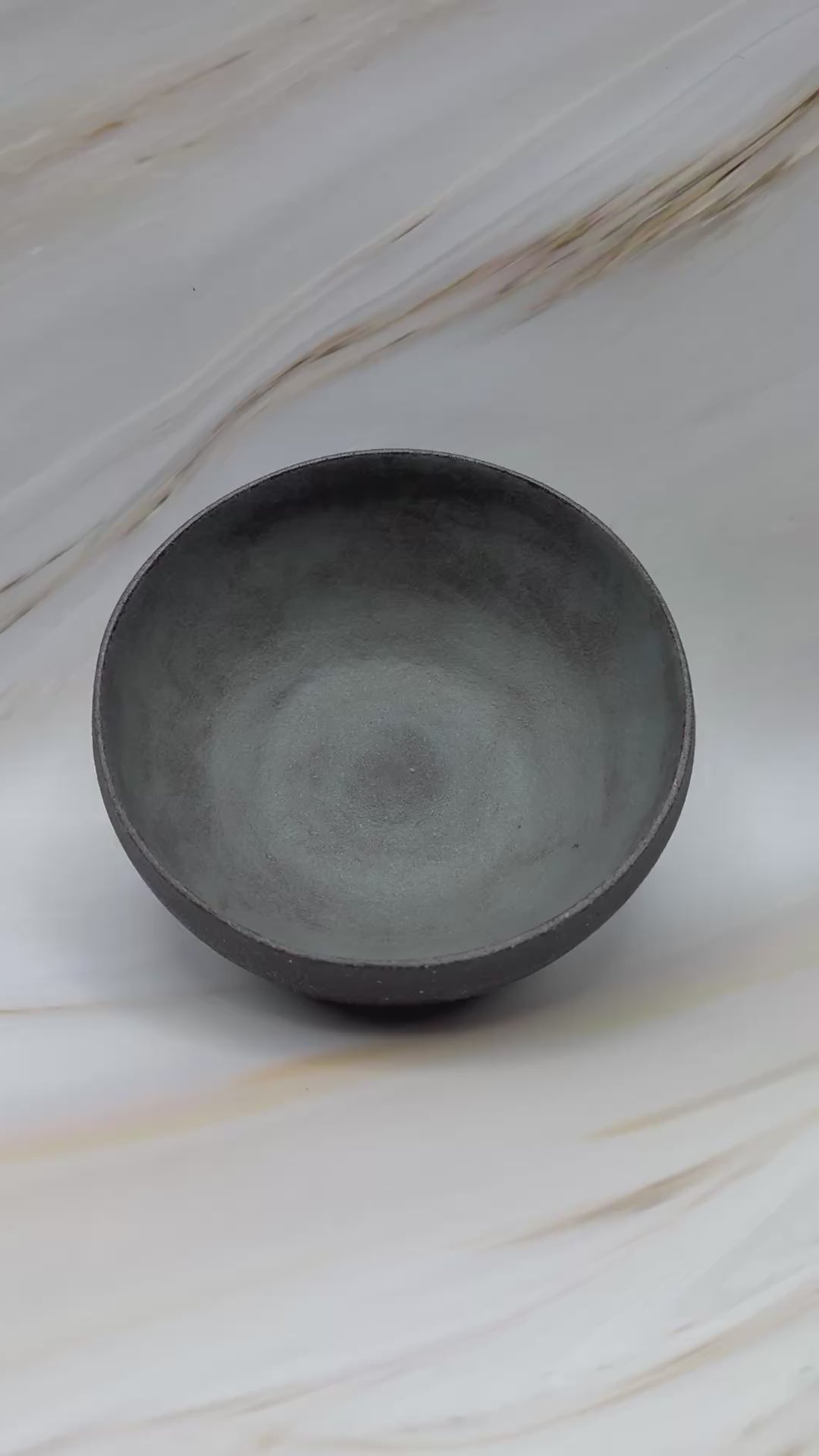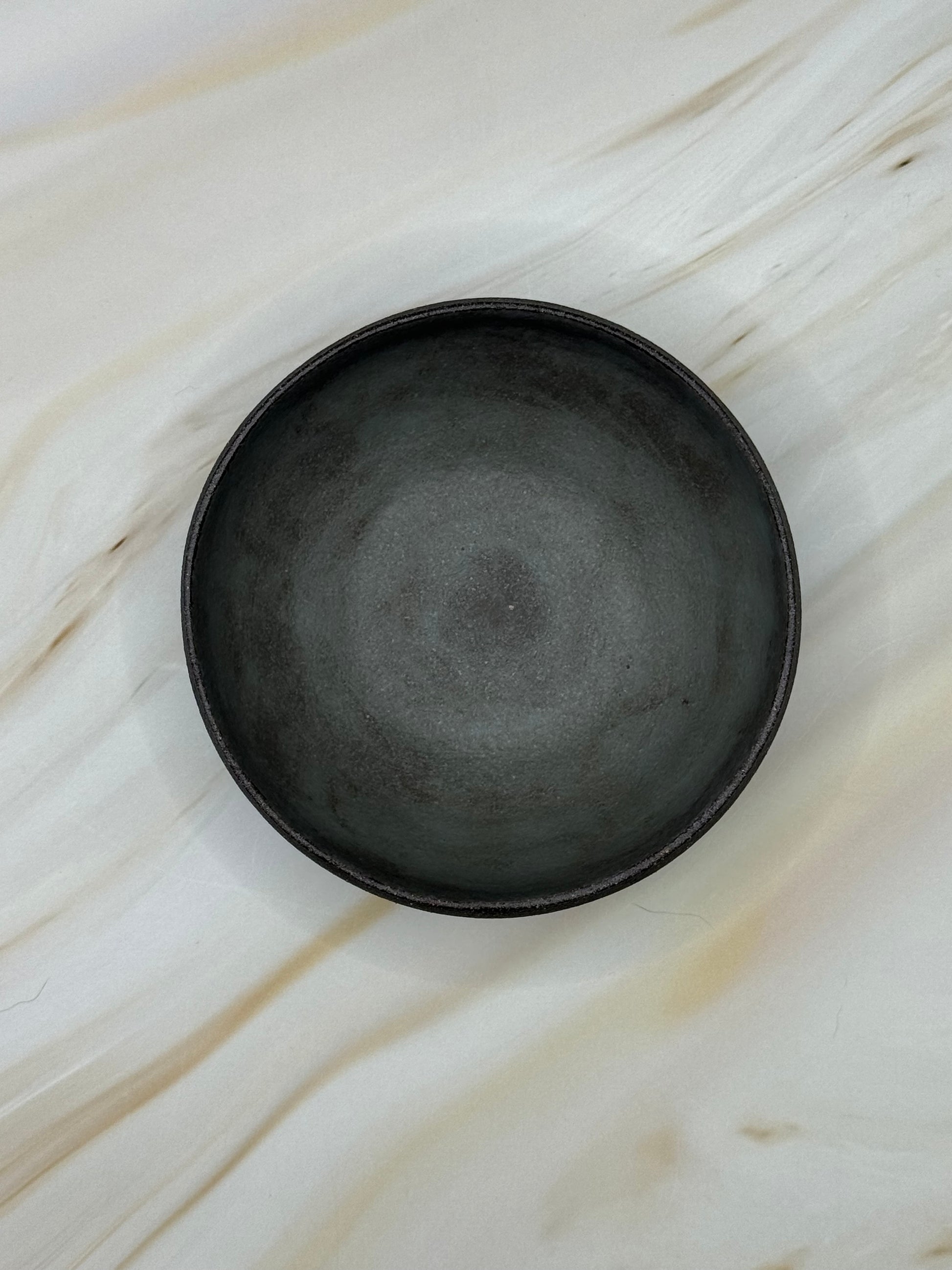 Artifact N-B-01, recovered from the Northern Wastes excavation site of Obsidian-12A, presents as a low, rounded basin with gently rising walls. The exterior holds a muted slate-gray finish with faint green undertones, resembling weathered stone worn smooth by time. Its compact form suggests use as a vessel for small offerings or measured portions, both practical and ceremonial in nature.