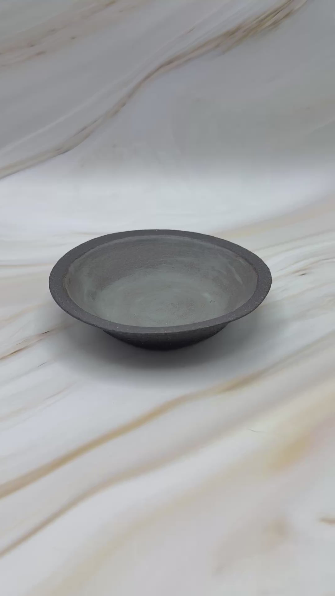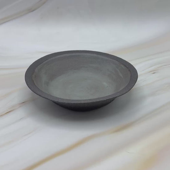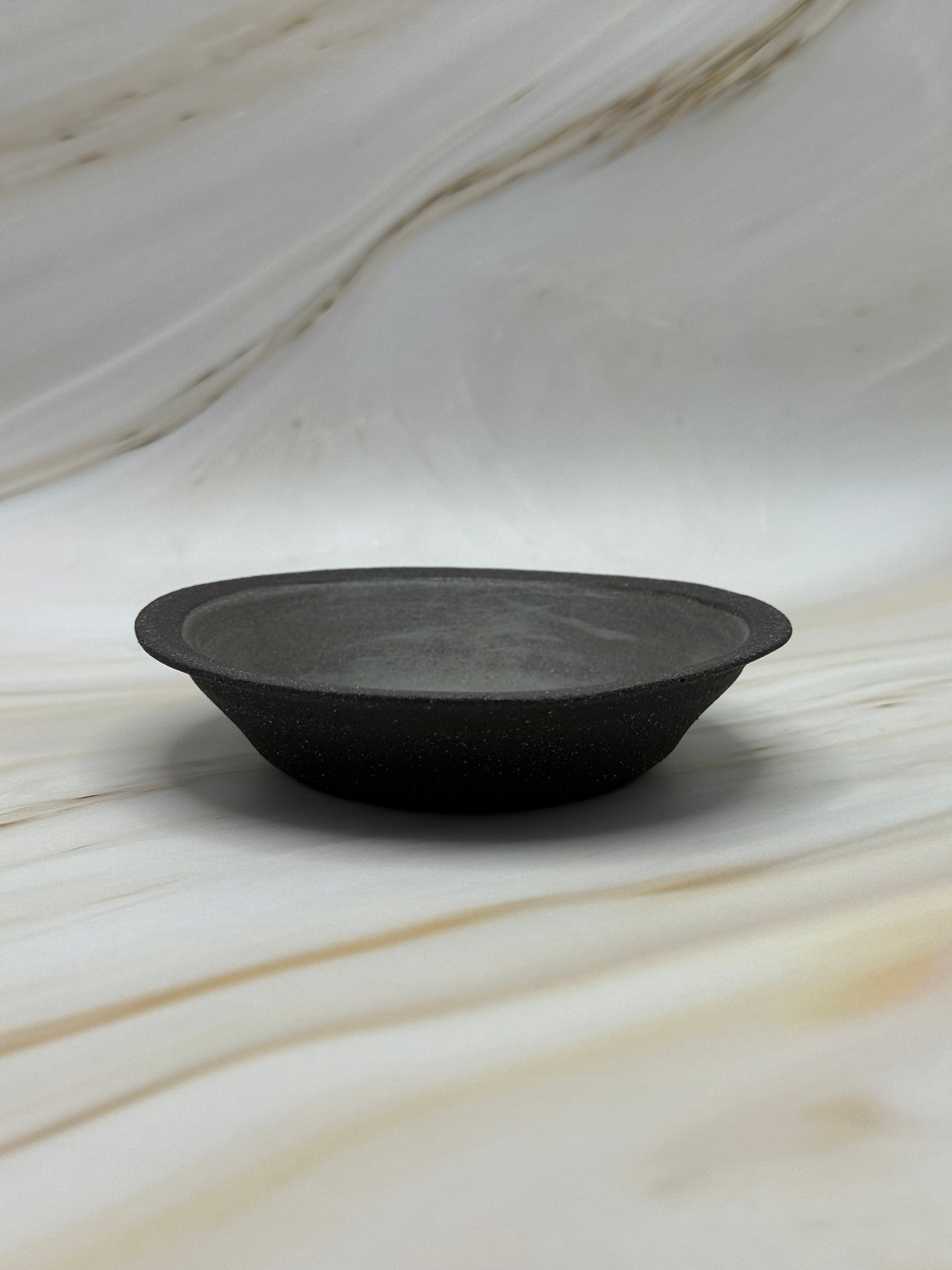 Artifact N-S-01, recovered from the Northern Wastes excavation site of Obsidian-12A, is a shallow vessel with a wide mouth and flattened form. The interior carries a muted slate-grey surface, its mineral-like finish soft and weathered, while the exterior remains dark and unglazed. Its open, dish-like structure suggests use for offerings, rations, or the careful presentation of gathered matter.