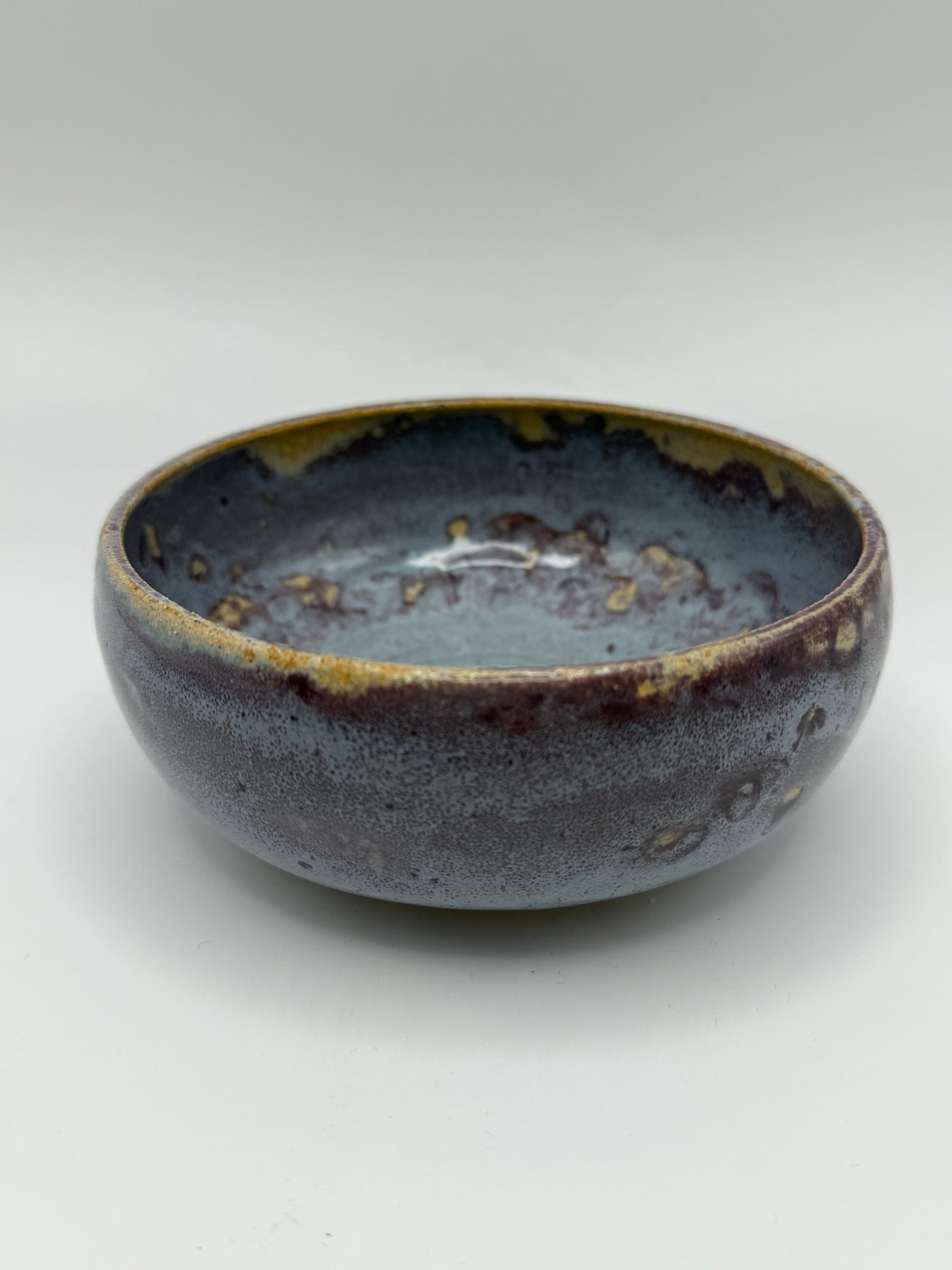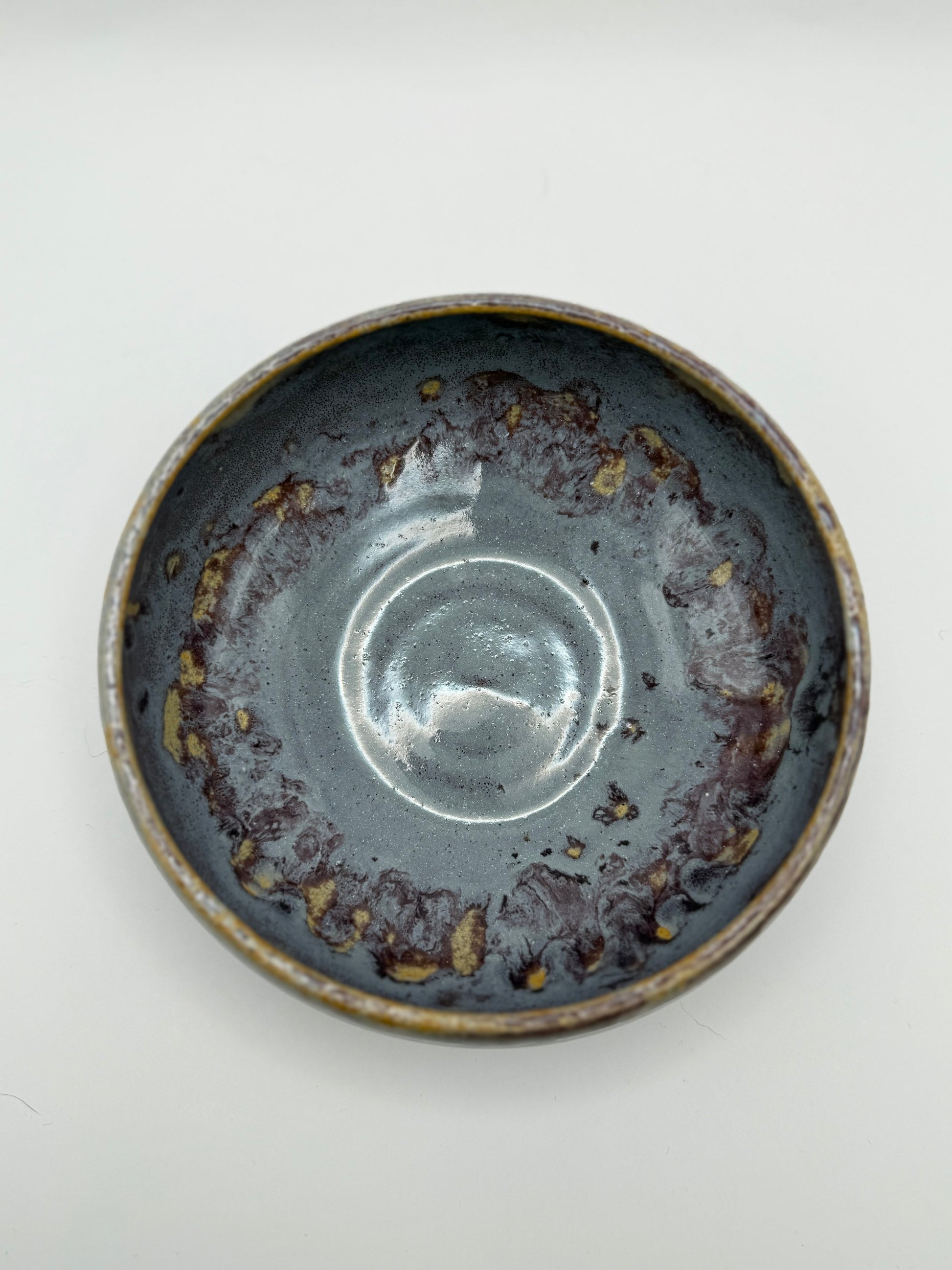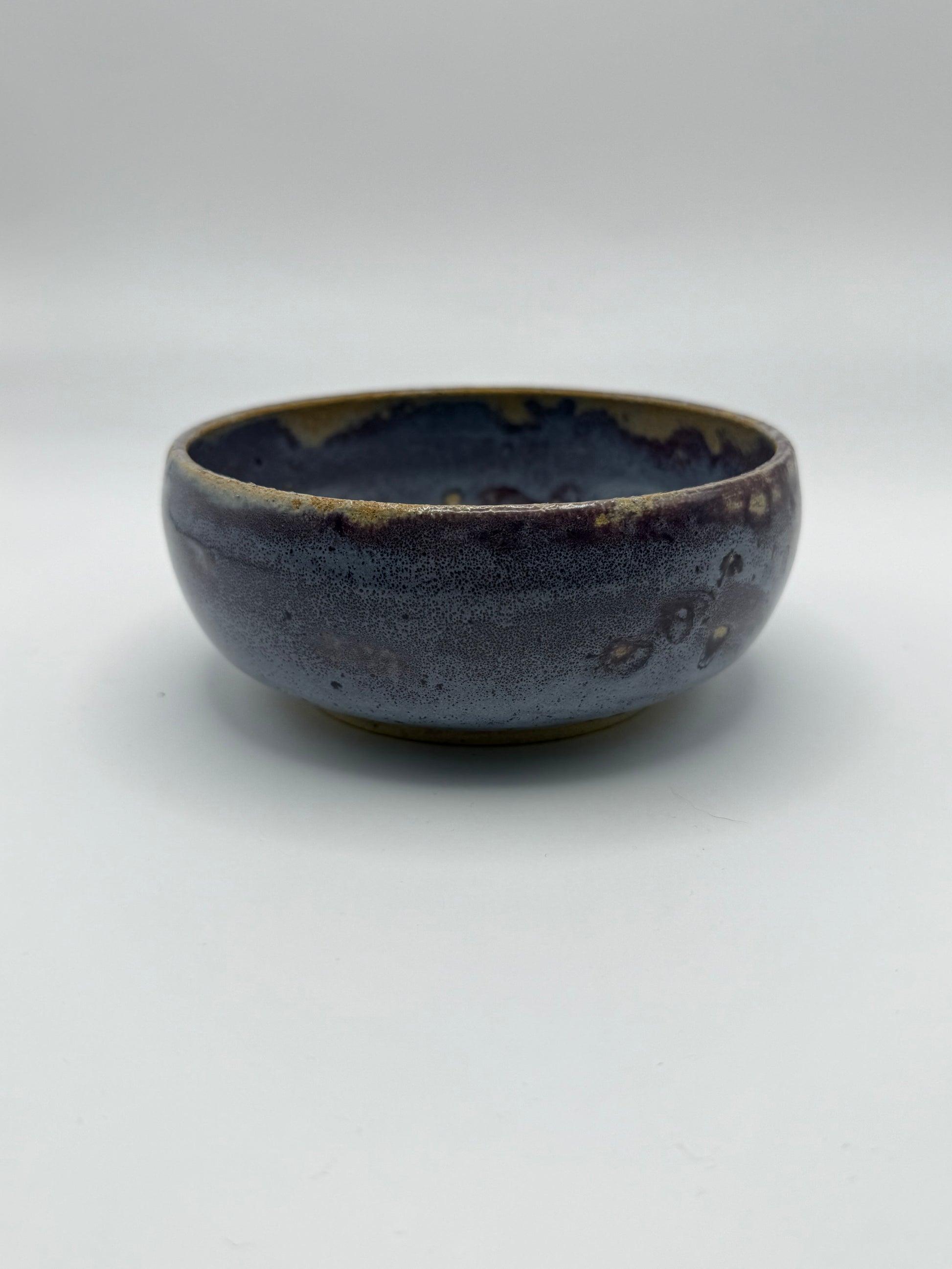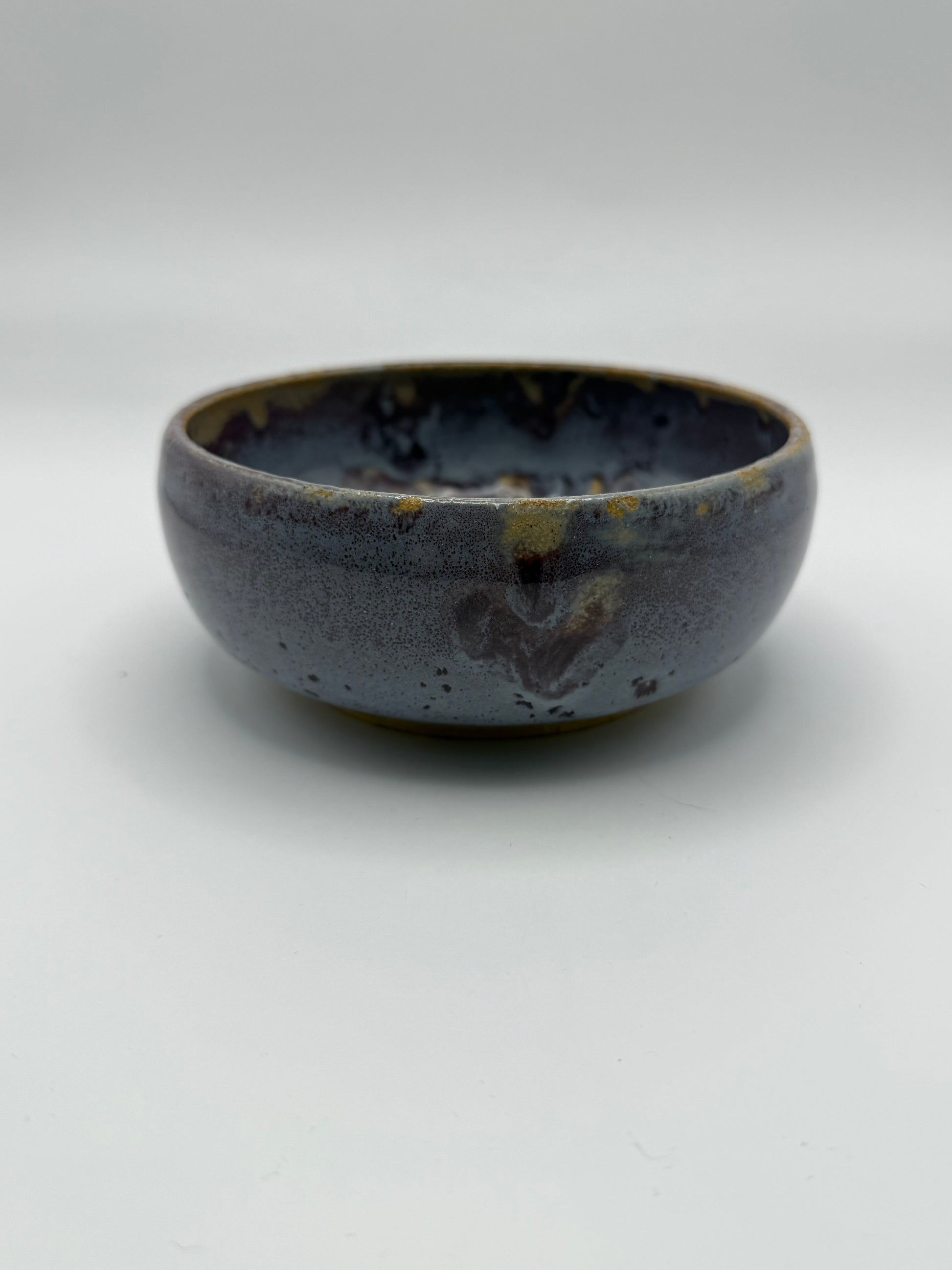 This piece is a reflection of my exploration with glaze application and surface design during my early pottery journey. The bowl features a blend of soft blue, earthy tones, and hints of deep purple that create an abstract and organic effect. While working on this piece, I encountered a few glazing errors—small inconsistencies in the surface texture and finish. These imperfections are part of my learning process and contribute to the bowl’s handmade charm and uniqueness.