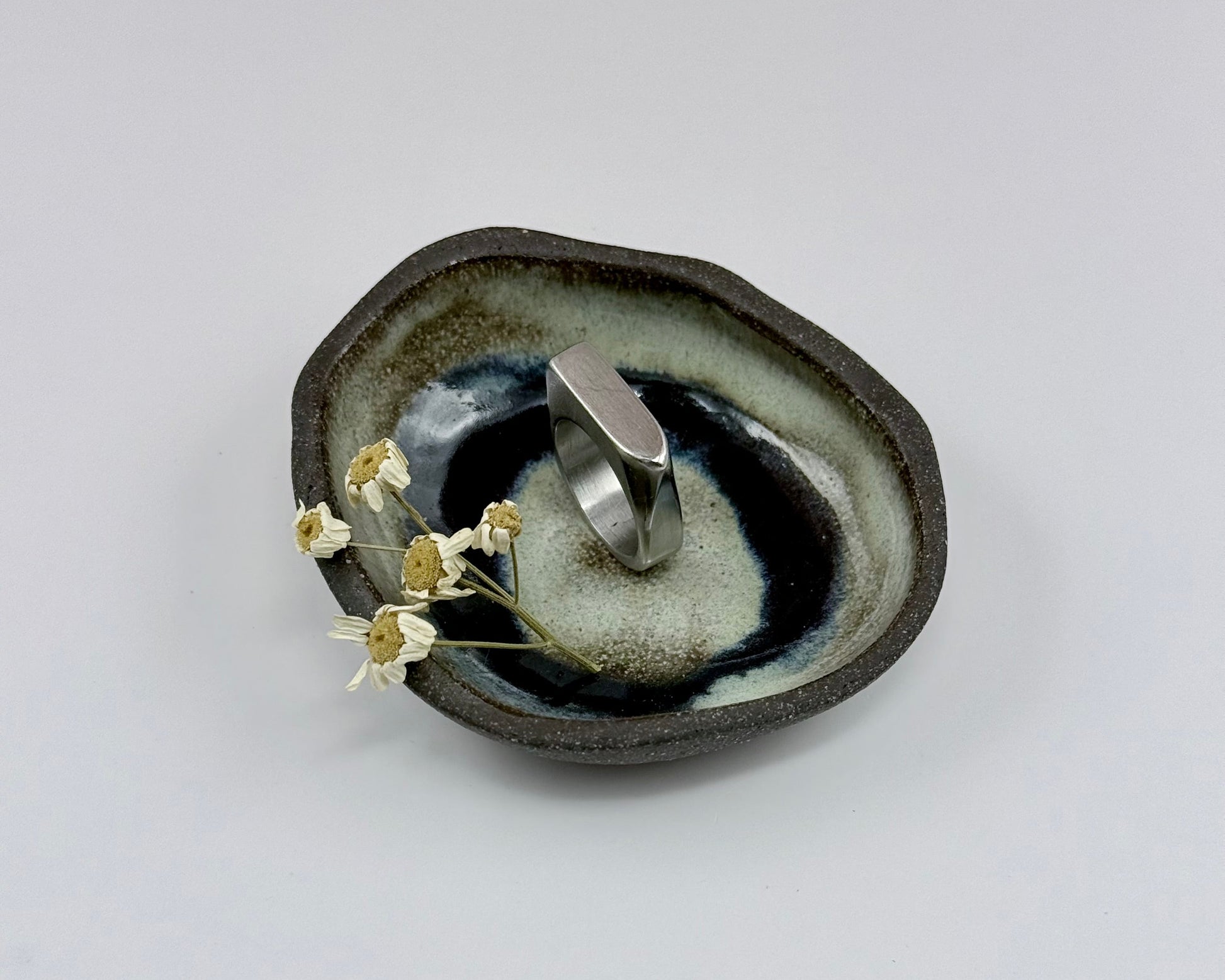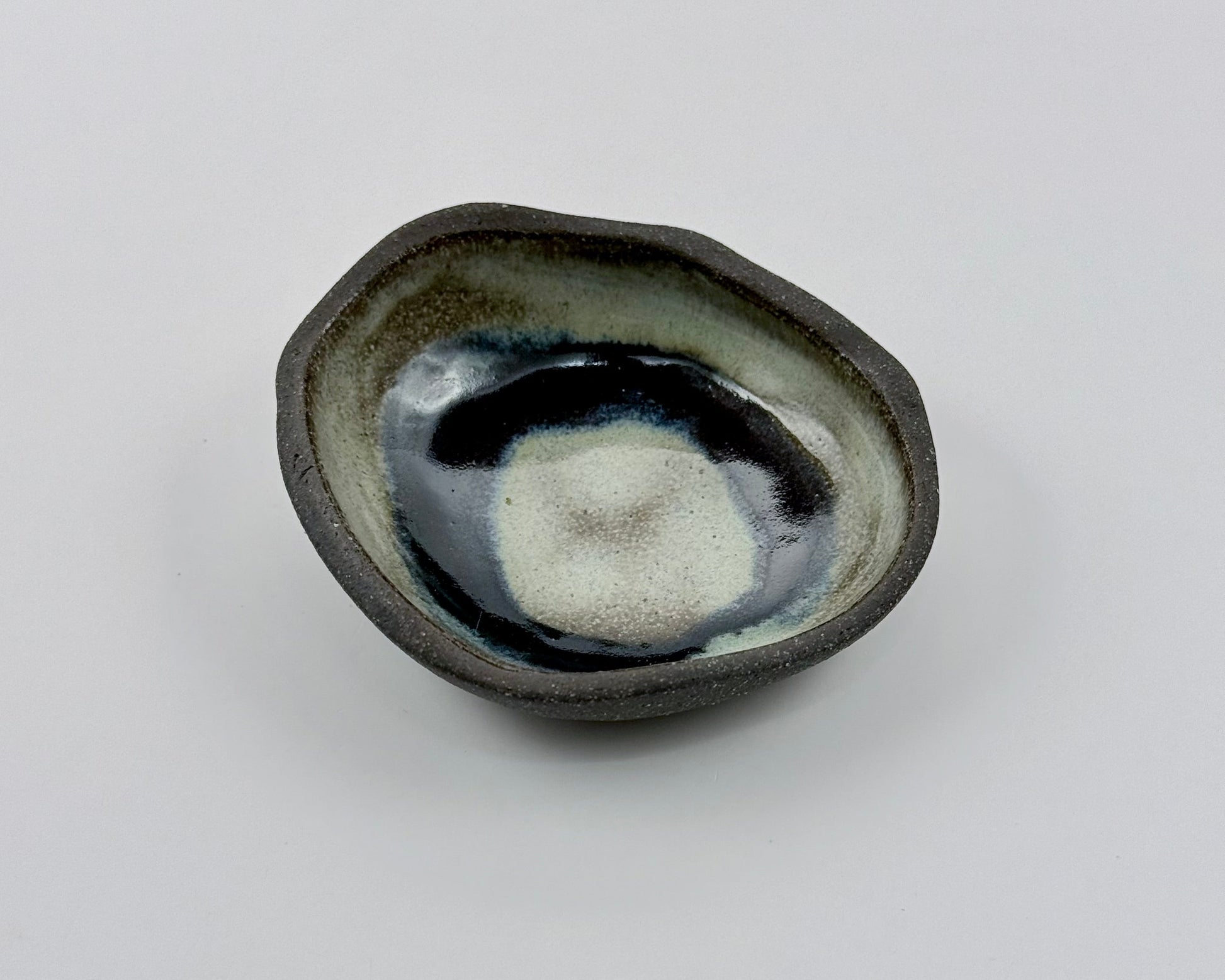 Part of the Held Imprint collection, Resonance IV features layered interior tones of deep blue, charcoal, and muted stone that extend outward from the center of the form, reflecting how emotional impact carries beyond its point of origin. The movement is gradual and uneven, following the natural flow of the glaze as it settles across the surface.