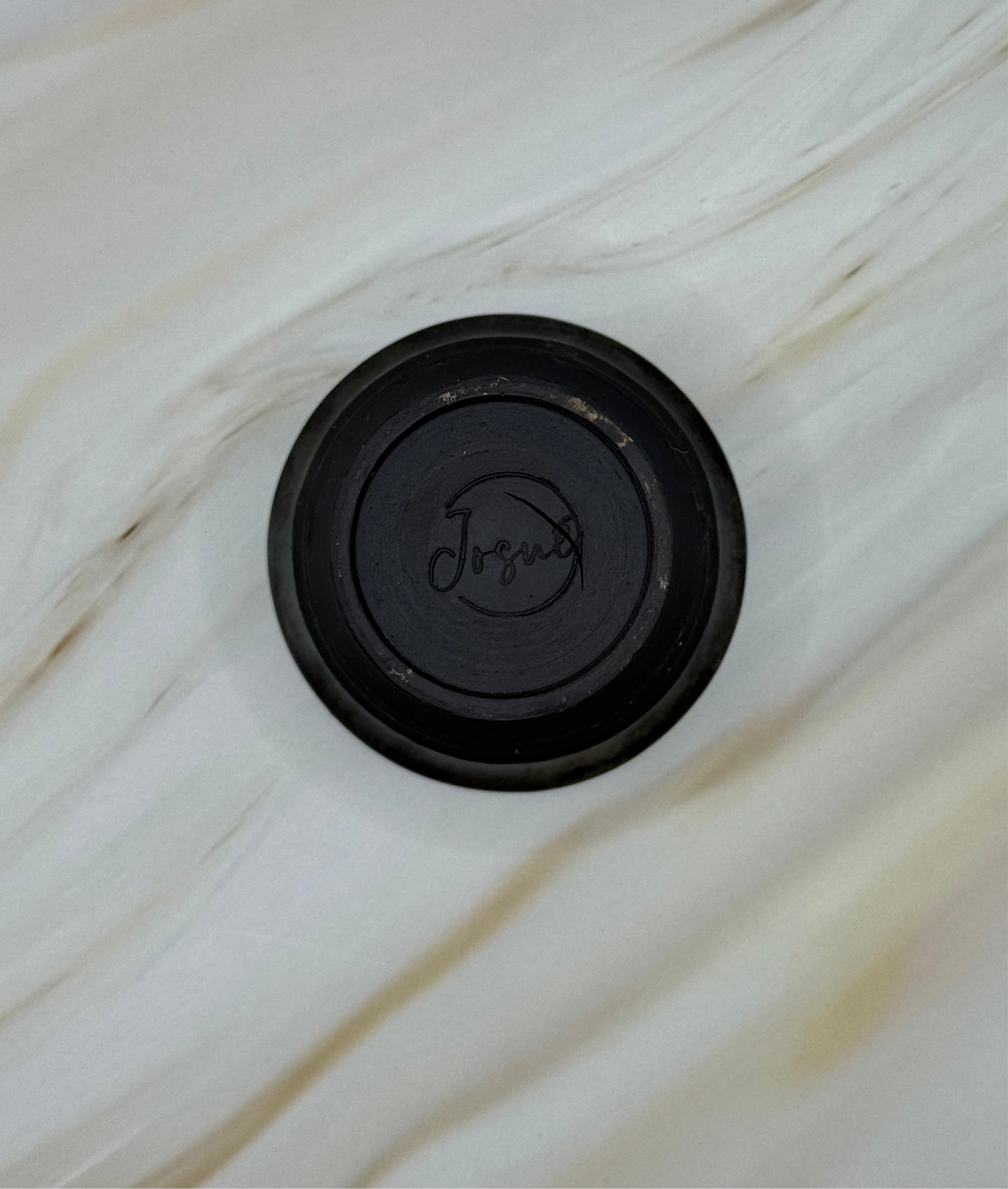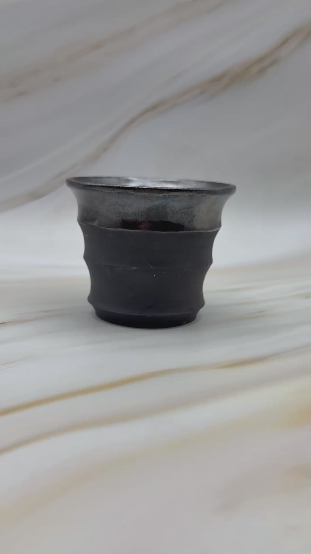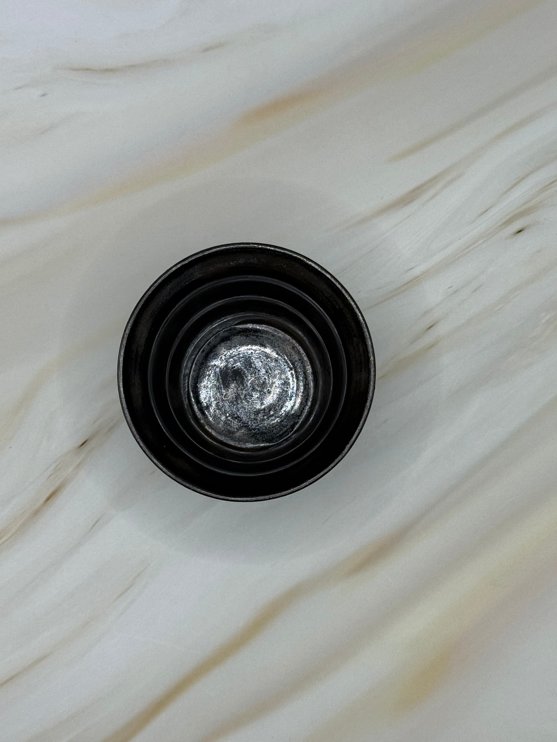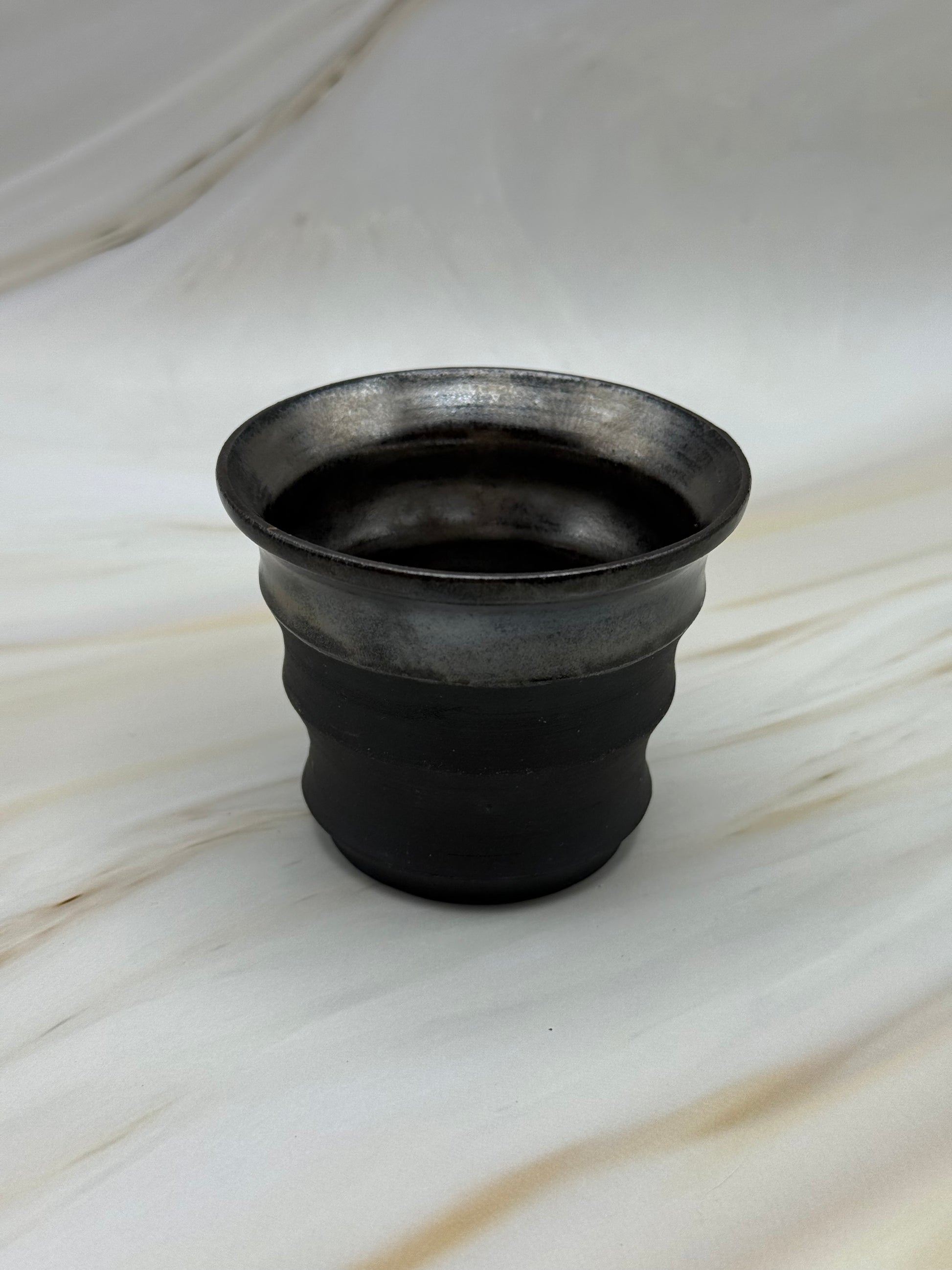 Artifact V-T-01, recovered from the Vulcan Crater excavation site of Obsidian-12A, displays a fluted, forge-like silhouette — narrow at the base, expanding sharply into a wide, commanding rim. The glaze interior burns with metallic silver and carbon tones, while the exterior remains grounded in matte black, echoing cooled iron fresh from the kiln.