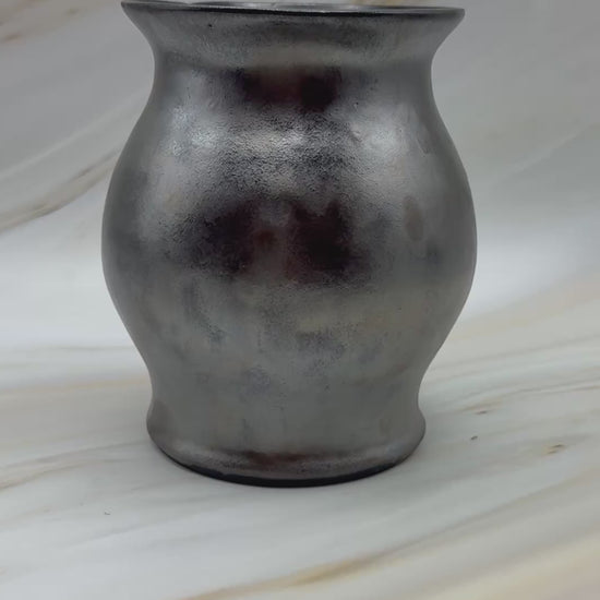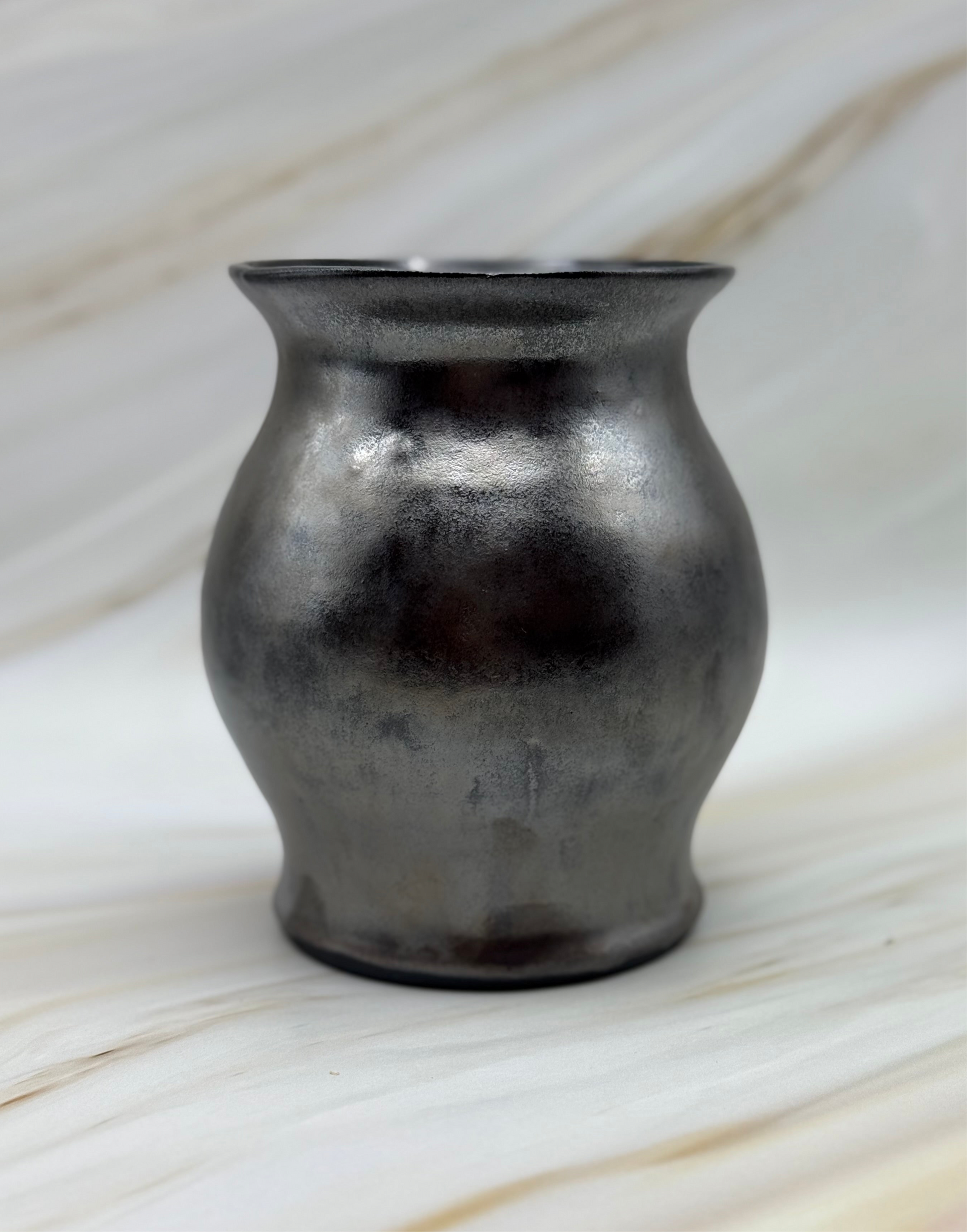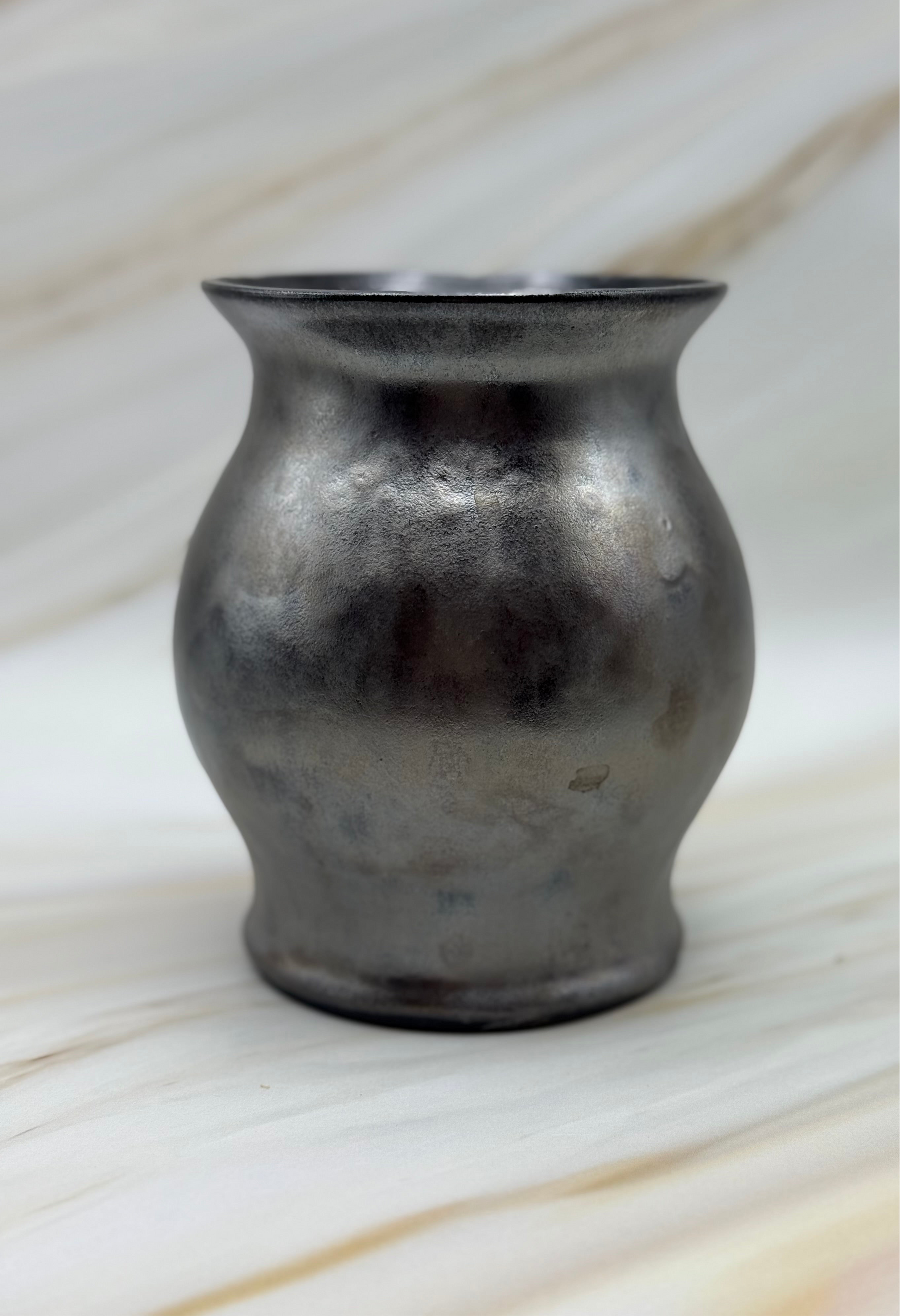 Artifact V-V-04, recovered from the Vulcan Crater excavation site of Obsidian-12A, rises in a fluted form with a wide base and a slightly tapered neck. The surface carries a metallic sheen — a blend of smoked silver and shadowed black that catches light like cooled forged steel. Its smooth finish gives it an industrial yet elegant presence.