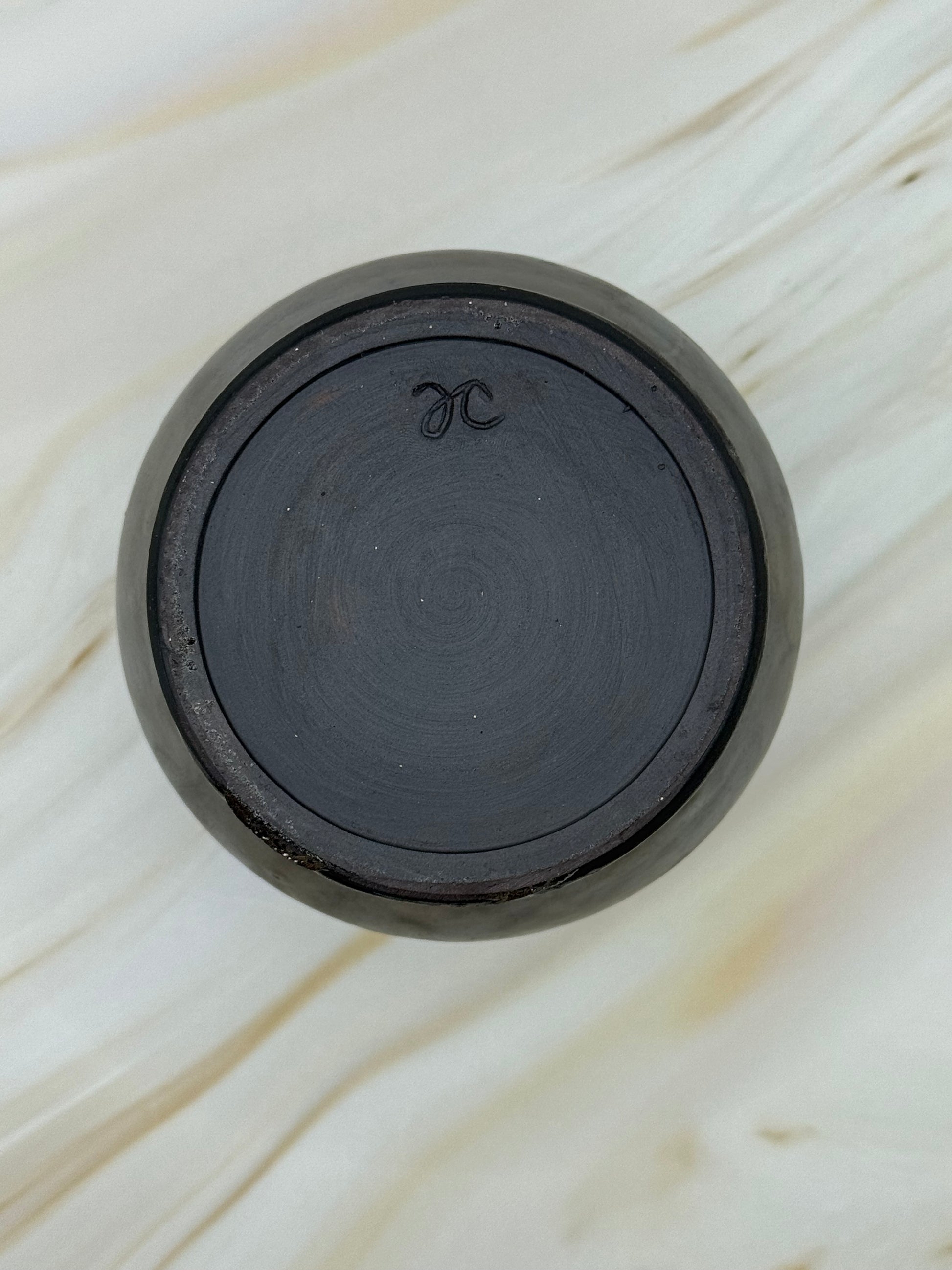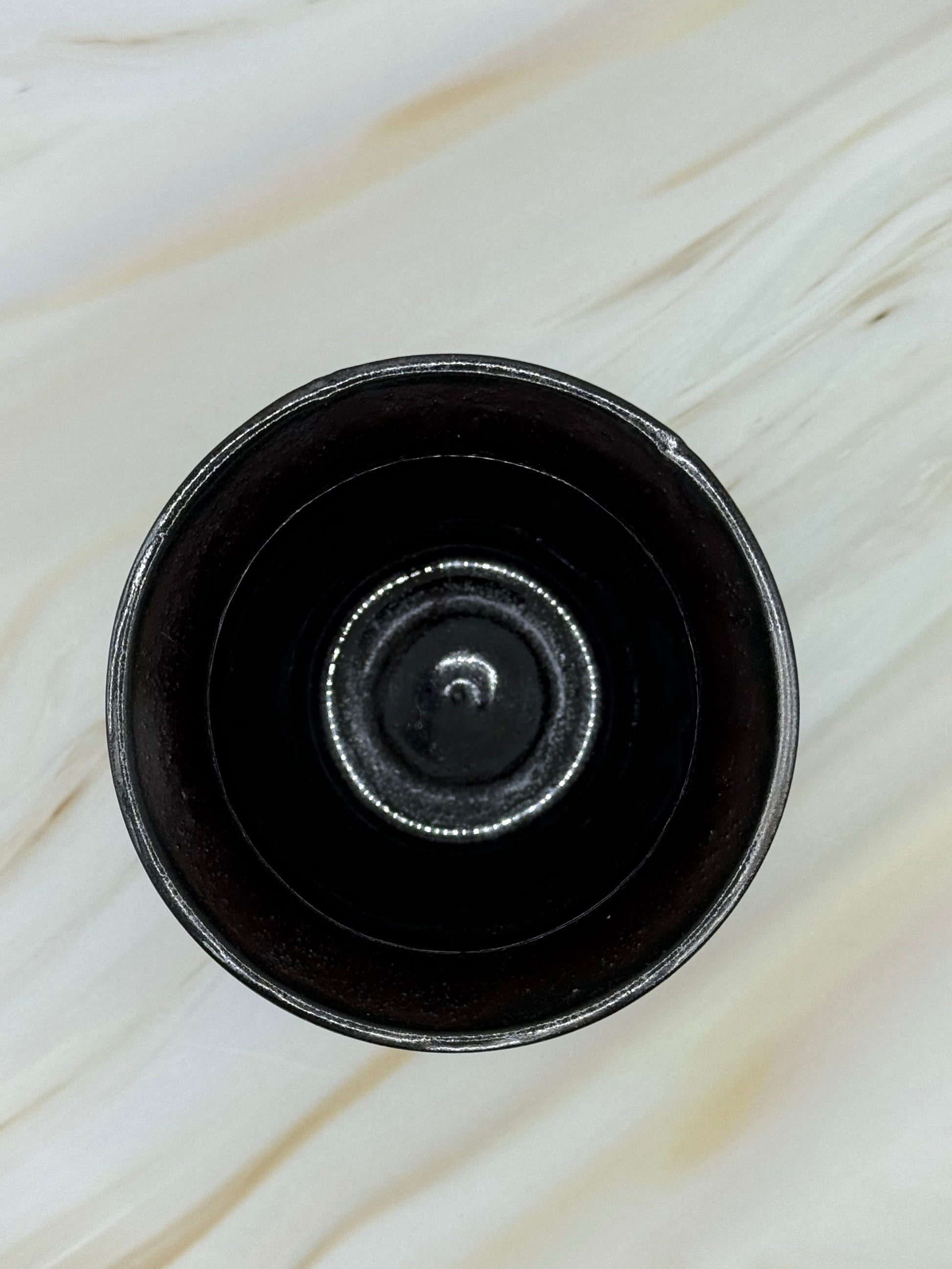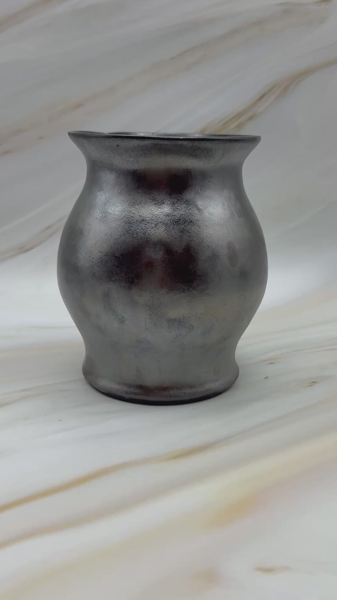 Artifact V-V-04, recovered from the Vulcan Crater excavation site of Obsidian-12A, rises in a fluted form with a wide base and a slightly tapered neck. The surface carries a metallic sheen — a blend of smoked silver and shadowed black that catches light like cooled forged steel. Its smooth finish gives it an industrial yet elegant presence.